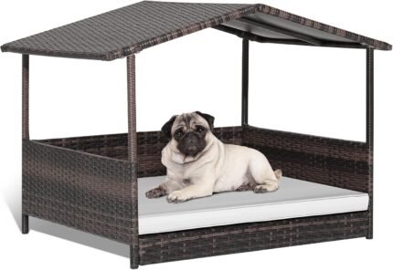 Tangkula rieten hondenhuis, binnen buitengegroeid rattan hondenbed w/verwijderbaar kussen, wasbare deksel, weerbestendig dak, rattan puppy -schuilplaats met verhoogde vloer voor kleine middelgrote honden (wit)