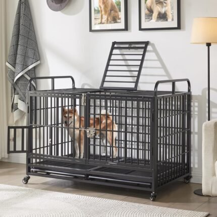 37 ” Heavy Duty Dog Crate, opvouwbare binnenhondenkooi met dubbele deur, 360 ° afsluitbare wielen en verwijderbare lade, gemakkelijk te reinigen en te monteren, voor kleine middelgrote grote honden
