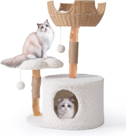 Moderne kattenboom, esthetische houtkattenboomtoren voor grote katten, luxe kattencondo met krassende palen en bloemplatforms, kattenmeubilair door easyego, (wit)