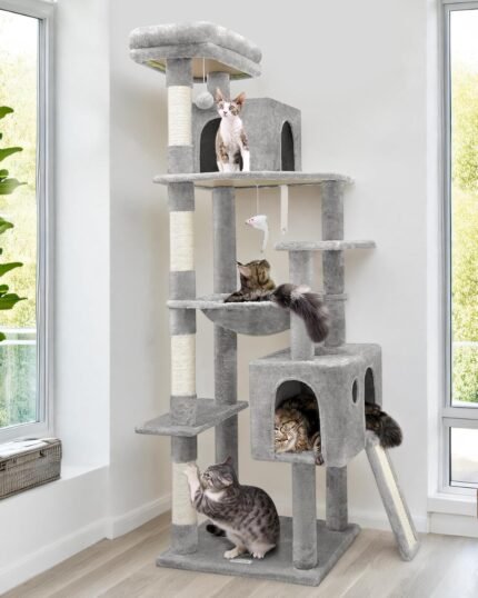 F70 Pro Heavy Duty Cat Tree, 70 inch stevige kattenboom voor binnenkatten Extra grote kattentoren met krassende paal, hangmat, kattenbond voor volwassen katten kittens, lichtgrijs
