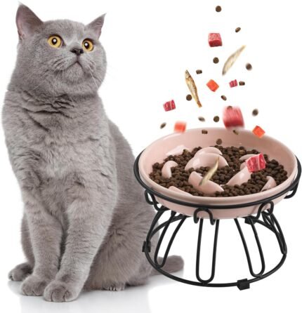 Verhoogde langzame voeder Cat Bowl – Keramische kattenvoerschotel met metaalstandaard, antislip – Pastel Series Langzame voedingsplaat – 7 oz – Lichtroze