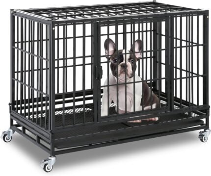 Huisdier 37 inch zware hondenkrat voor middelgrote honden, stapelbare hondenkooi met vier afsluitbare wielen, verwijderbaar dienblad en rooster, open top, ontsnappingshond hondenkennel indoor