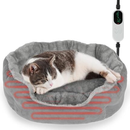 Verwarmd kattenbed voor binnenkatten, 20 “kattenverwarmingskussen met timer en temp verstelbaar, wasbaar kalmerend huisdierbed met verwarmingskussen voor katten en kleine honden, grijs elektrisch bedverwarmer voor kittenkat