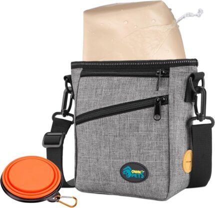 Ownpets hondentraining zakje met siliconen voering, huisdierbehandeling trainingszakje met opvouwbare kom, schouderriem en taille band, 4 manieren om te dragen, wandelhaaspakket voor hondentraining – grijs
