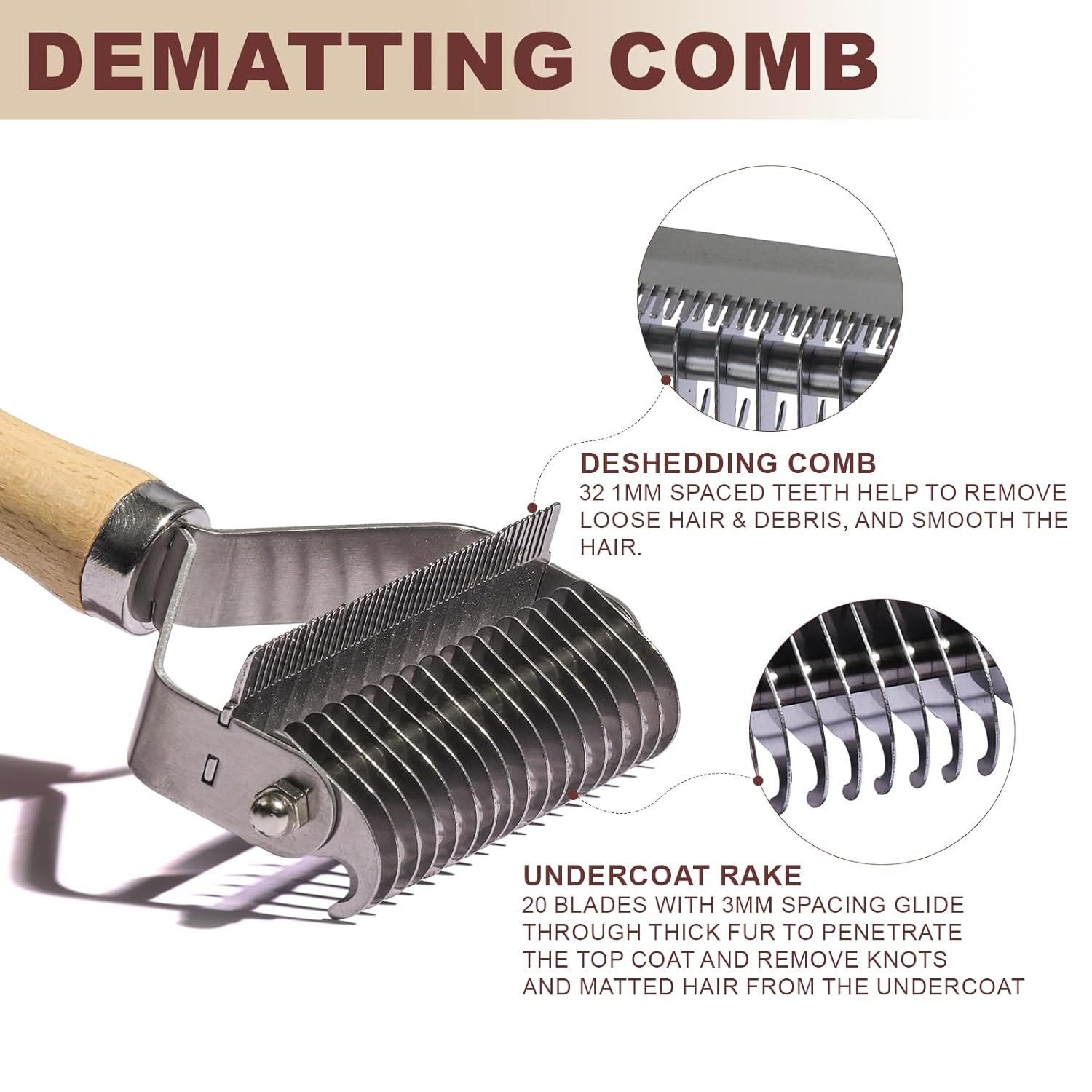 3-in-1 professionele huisdierenafscheiding Demating Comb-Deshedding Undercoat Hark voor honden met roestvrijstalen messen metalen huisdierborstel met houten handvat gematteerd haar ontworpen dunner worden en afwerpen