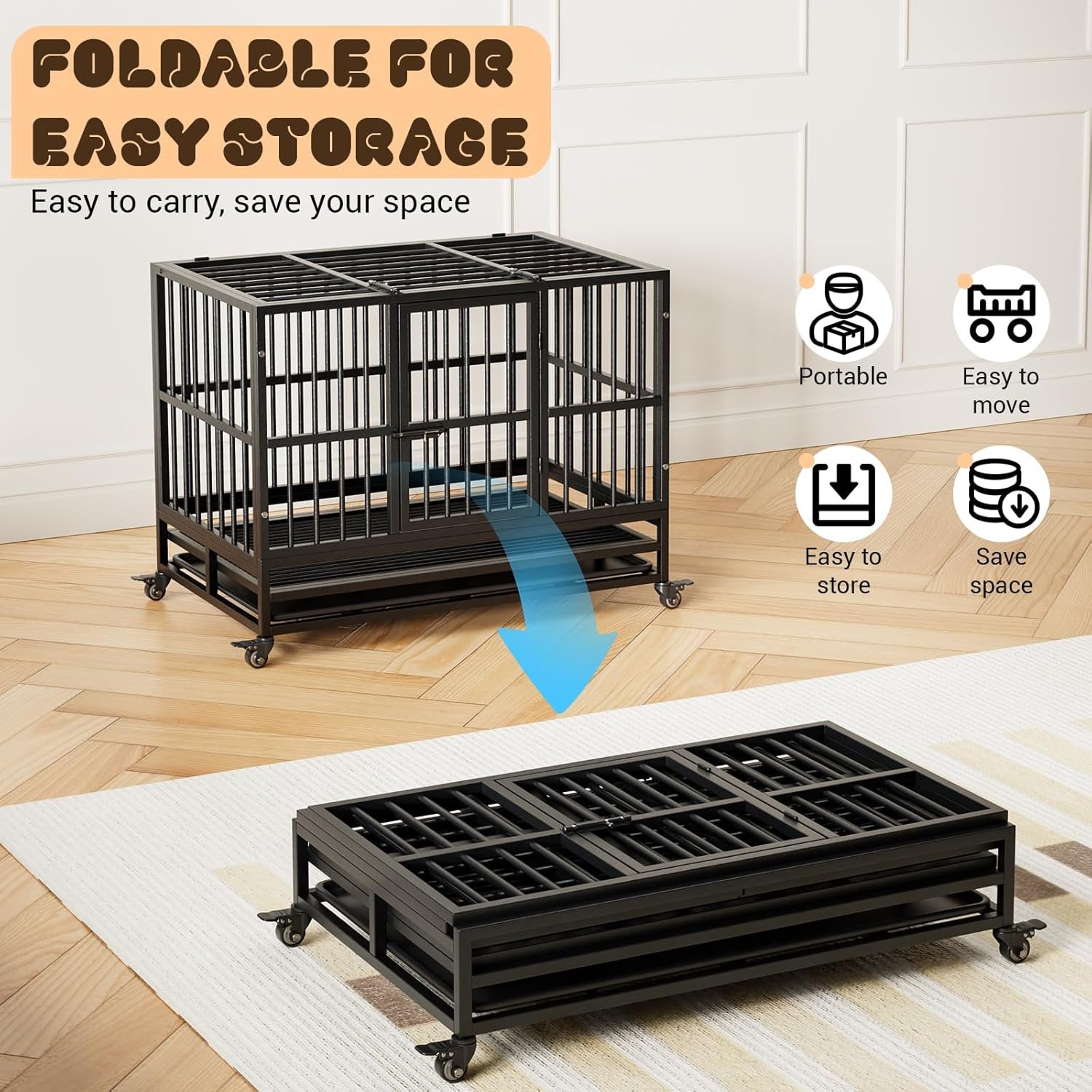 (Gemakkelijk te monteren en te vervoeren) Het opzetten van uw hondenkrat is een fluitje van een cent! zodat één persoon het gemakkelijk in slechts 15 minuten kan opzetten. Het gemak van 360 graden zwenkwielen met remmen maakt het moeiteloos en veilig om de krat rond te rollen. Bovendien zorgt de vouwstructuur voor plat opslag en eenvoudig transport, waardoor het ideaal is voor reizen of verhuizing. Geniet van het gemak van een gebruiksvriendelijk ontwerp waarmee u zich kunt concentreren op uw huisdier in plaats van gecompliceerde assemblageprocessen.