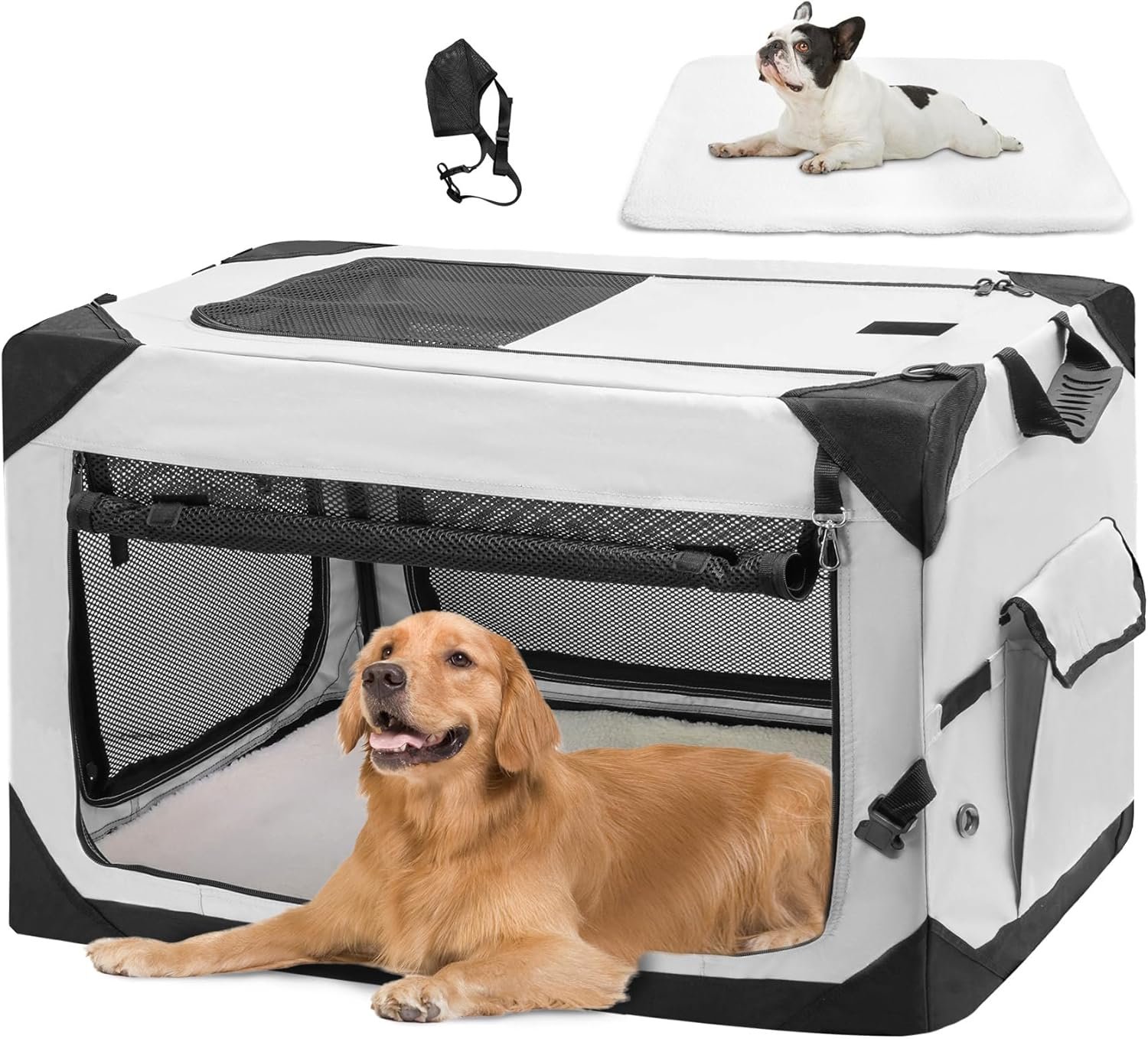42 “zachte opvouwbare hondenkrat, draagbare reishondenkrat voor extra grote honden binnen en buiten, 4-deurs opvouwbare hondenkennel met veiligheidszippers, maasramen, zachte mat voor reizen of thuisgebruik