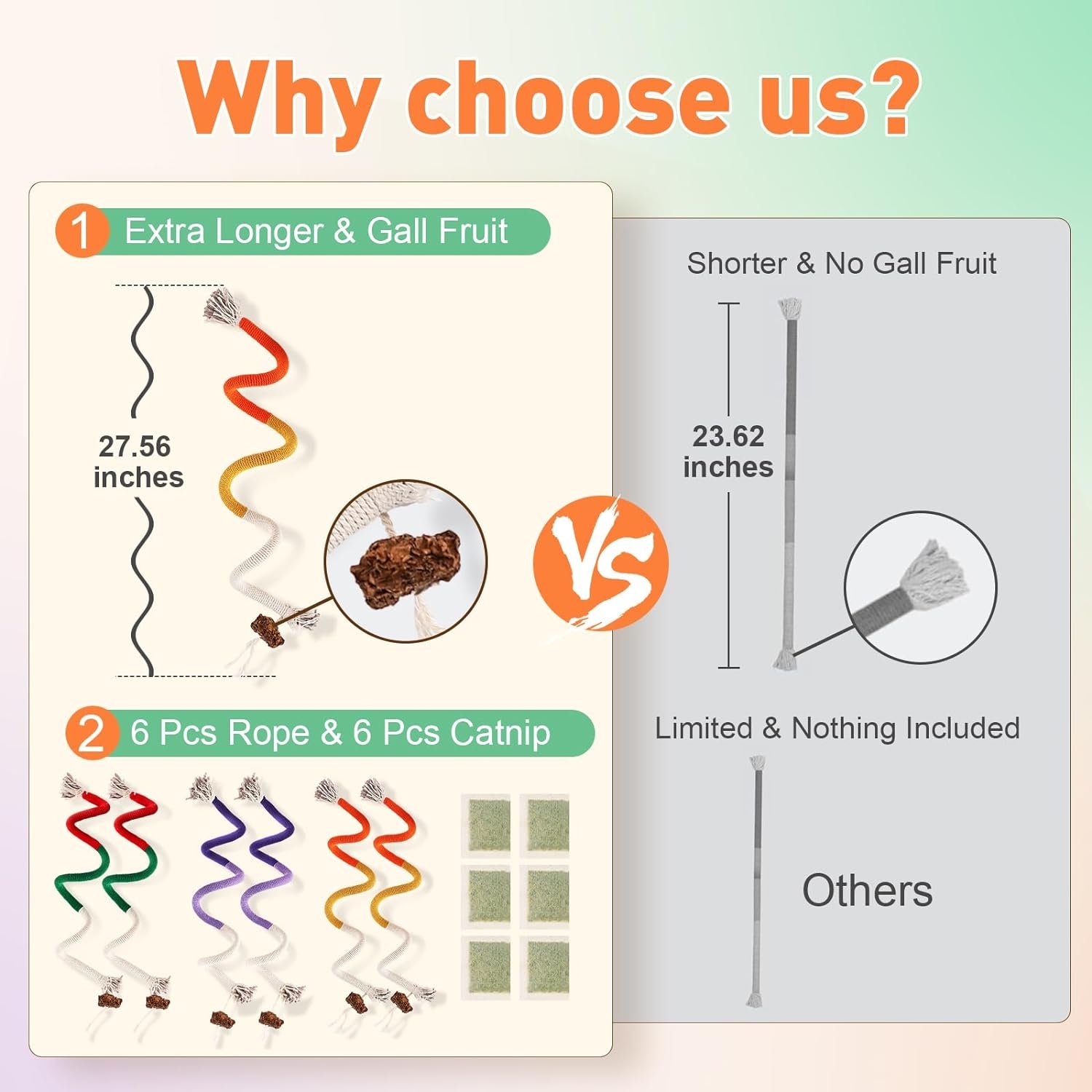 【Perfect Gift Cat Chewing Toy】 Deze Cat Chewing Toy Set wordt geleverd in een pakket met een geweldige waarde met 3 kat speelgoedtouwen en 3 zakken Catnip. De catnip -speelgoedtouwen hebben een wetenschappelijk ontworpen mix van kleuren die verleidelijk zijn voor katten, waarbij de aandacht van uw kat wordt getrokken. Het kittentandenreinigingsspeeltje is 27,56 inch lang, en bevredigt al het bijten- en schopbehoeften van je kat in solo en interactief spel. Dit kattenspeelgoed is het ideale cadeau voor je katachtige vriend.