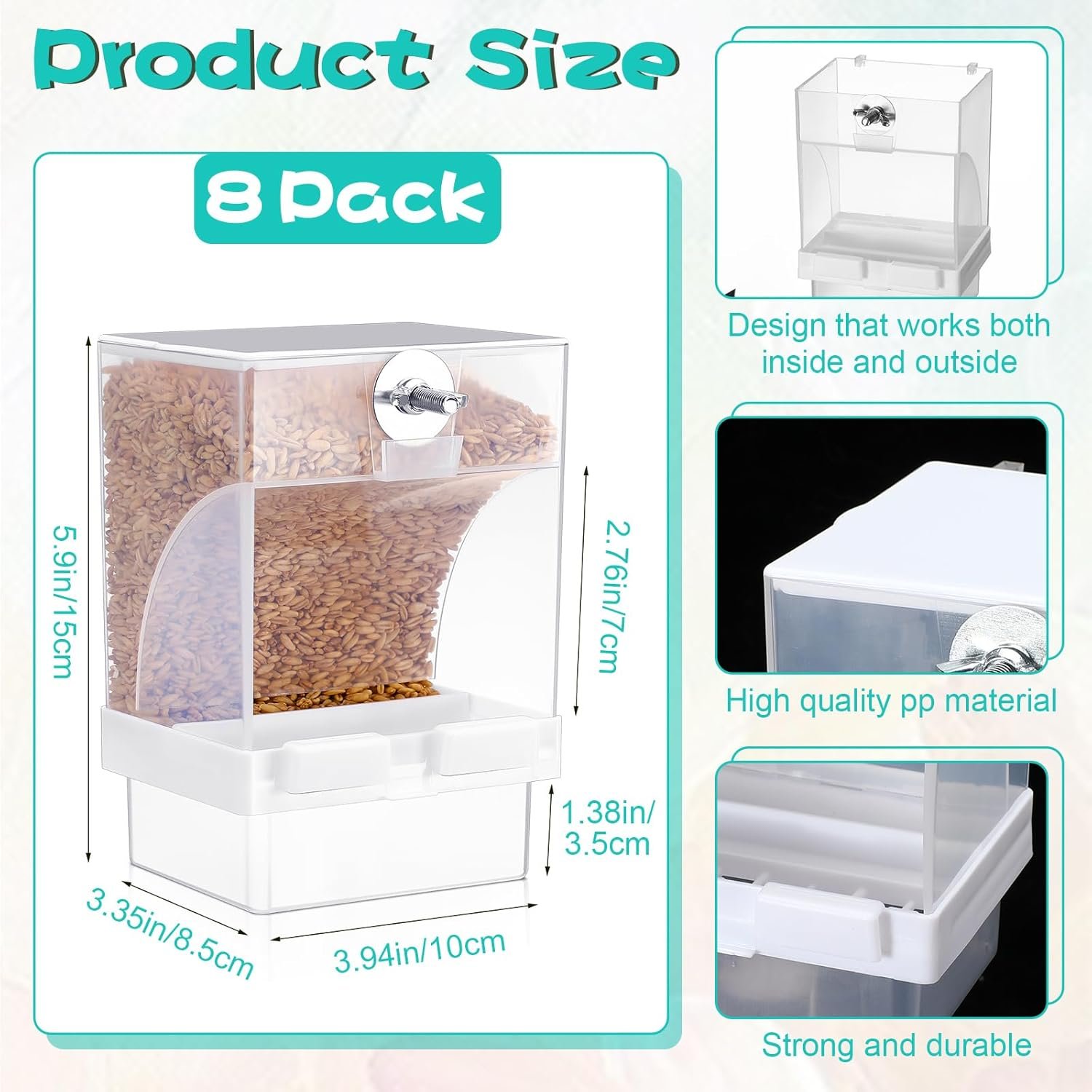 Geschikte grootte: meten van ongeveer 3,94 x 3,35 x 5,91 inch/ 10 x 8,5 x 15 cm, de vogelvoeder voor kooi biedt een geschikte grootte voor het accommoderen van verschillende vogelsoorten en biedt een royale capaciteit; Met de mogelijkheid om ongeveer 350 g vast te houden, minimaliseren deze feeders de behoefte aan frequente vullingen, en zaden kunnen voor de meeste vogels ongeveer 7-15 dagen worden opgeslagen en bieden gemak voor vogelliefhebbers; Bevestig dat de maat voor u geschikt is voordat u een bestelling plaatst