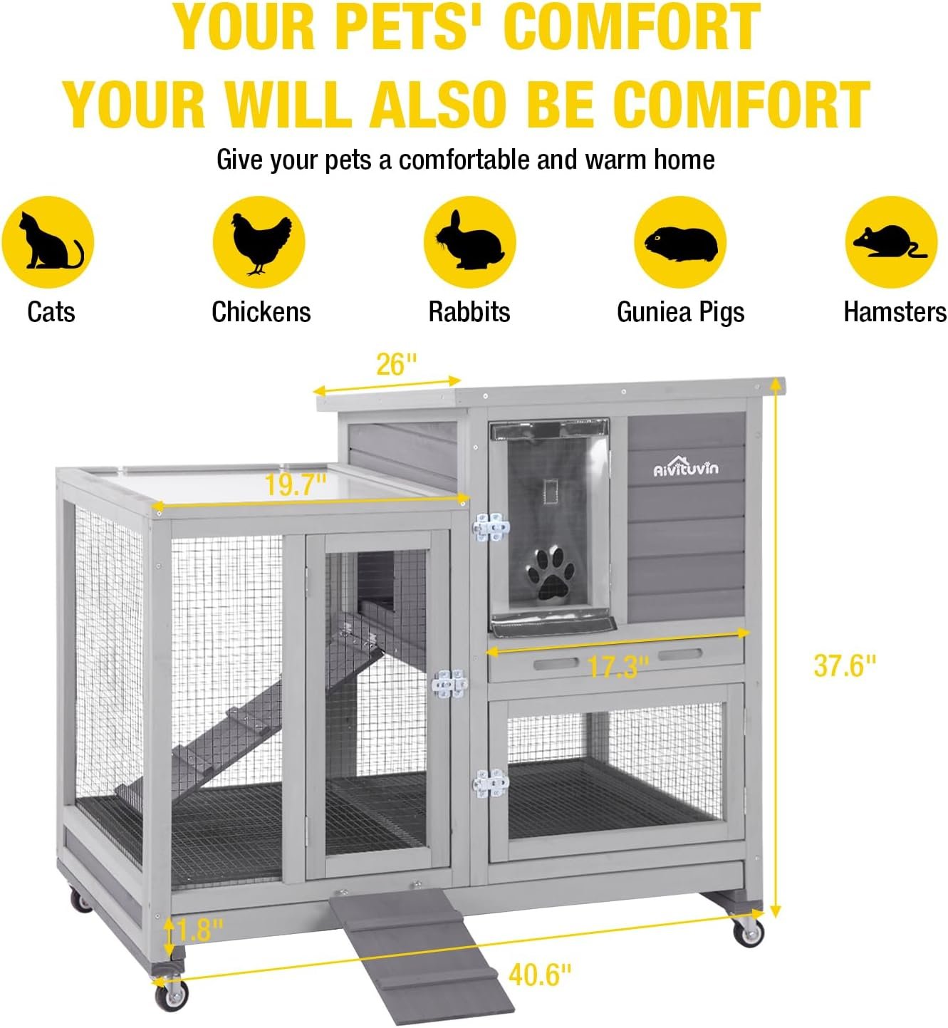 Aivituvin konijn hok grote houten konijnenhuis cavia -kooien op wielen, twee bakjes, binnen buiten