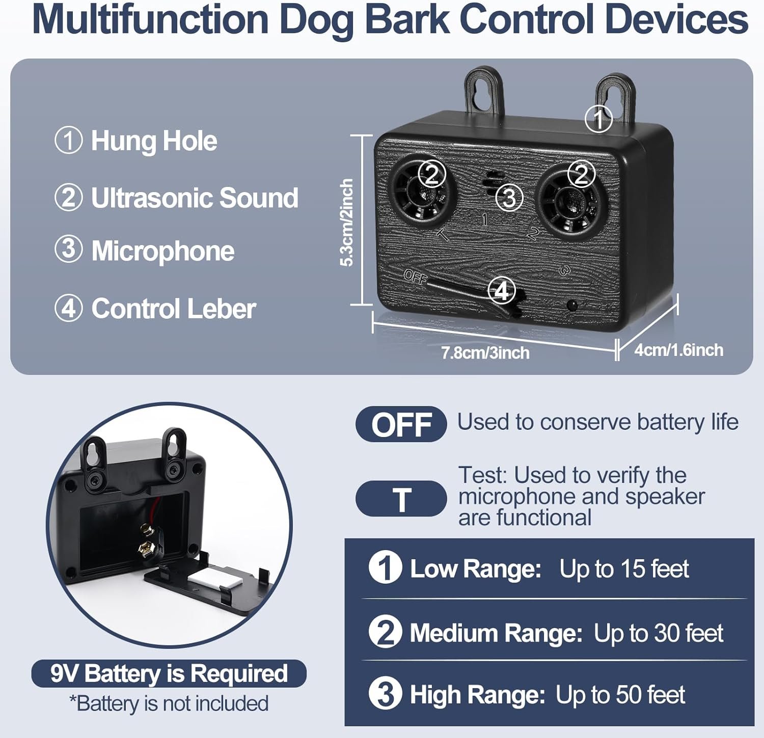【Gemakkelijk te gebruiken blaffende doos】 Onze ultrasone hondenschors afschrikking is compact en lichtgewicht, en kan gemakkelijk worden geïnstalleerd op het hondenhuis, het hek, de tuinhek, de tafel of de boom, enz. Het is eenvoudig te bedienen en gemakkelijk te gebruiken en kan worden gebruikt en met u gedragen tijdens buitenactiviteiten. Een 9-volt batterij is vereist om het niet-blaffen-apparaat voor honden te gebruiken (batterij niet inbegrepen).