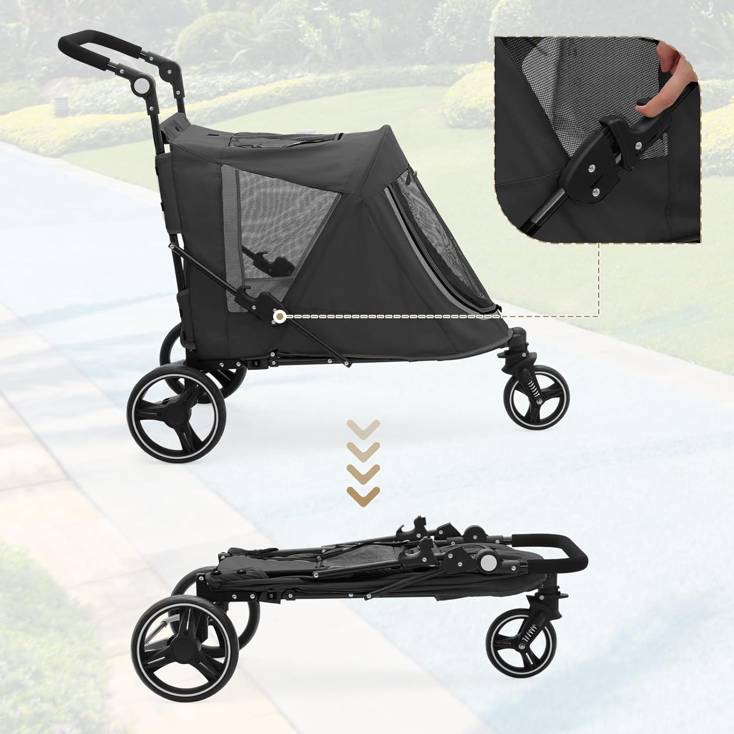 Handig systeem met dubbele entry: specifiek ontworpen met het welzijn van oudere of huisdieren met mobiliteitsuitdagingen in gedachten, onze kinderwagen bevat dubbele deuren met rits, zowel aan de voor- als achterkant. Dit doordachte ontwerp zorgt voor gemakkelijke toegang voor huisdieren, waardoor ze worden geëlimineerd om zich om te draaien bij het betreden of verlaten, een attent geschenk presenteren voor uw gekoesterde metgezellen.