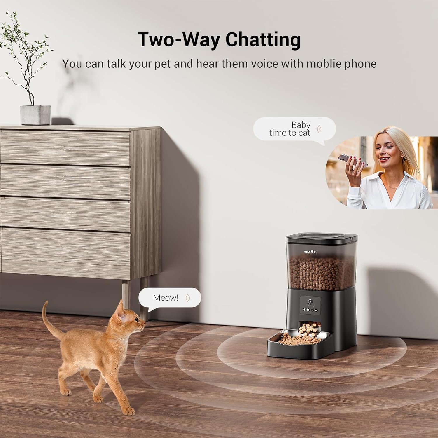 Tweezijdige audio- en maaltijdoproep: blijf verbonden met uw huisdier met behulp van het tweerichtingsaudiosysteem; interactie met ingebouwde luidsprekers en microfoon in realtime; Noteer een gepersonaliseerd spraakbericht tot tien seconden lang om automatisch te spelen tijdens het voeden, waardoor uw huisdier wordt herinnerd, het is de maaltijd
