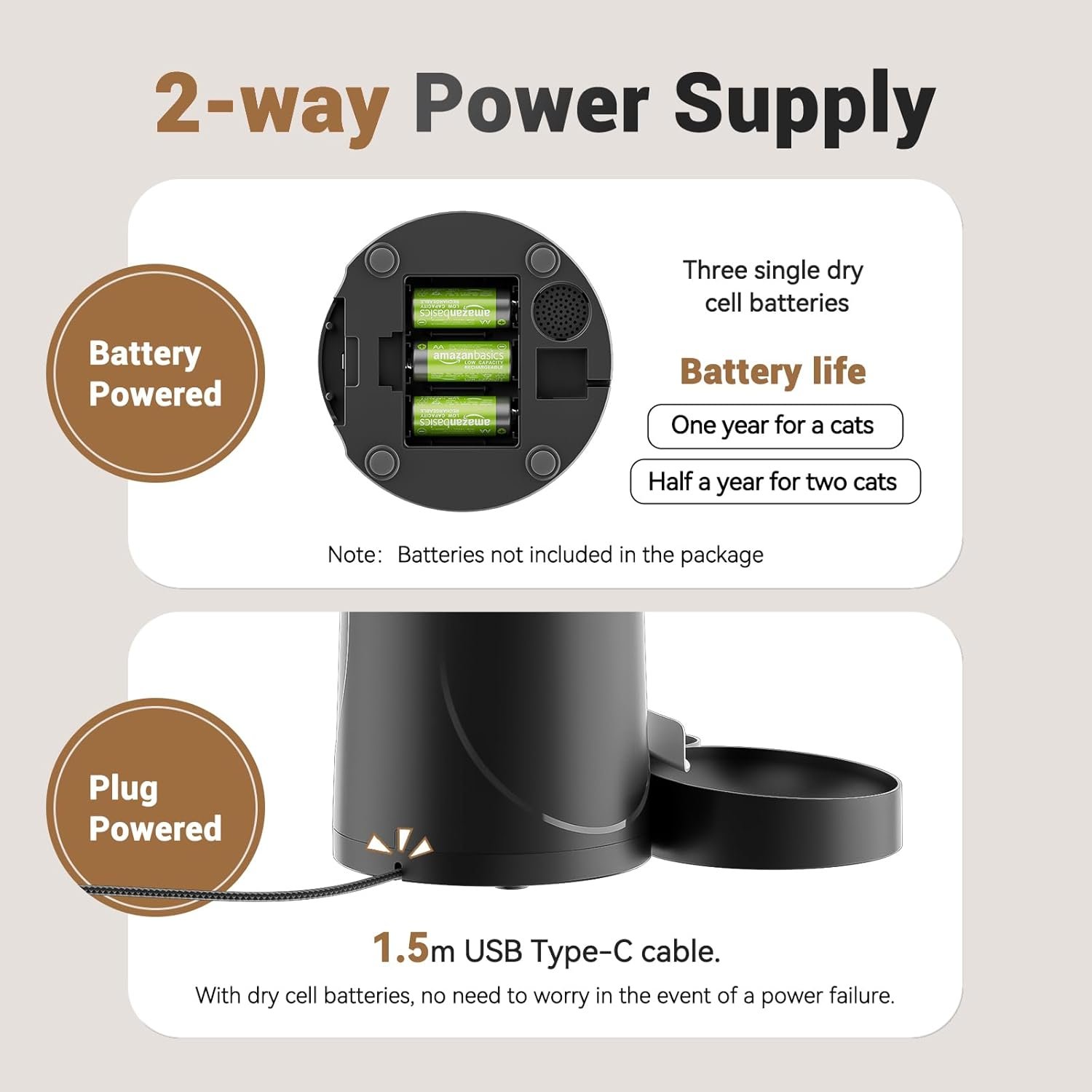 Dubbele voeding: deze multi-automat-kattenvoeder loopt op een netsnoer of batterijback-up om ervoor te zorgen dat deze blijft werken, zelfs tijdens een stroomstoring, zodat uw huisdieren nooit een maaltijd missen (geen batterijen inclusief batterijen), gebruik 3x d-size batterijen; Het wordt niet aanbevolen om alleen met batterijen te werken. Werken met alleen batterijen kan het leven slechts ongeveer 7 dagen duren