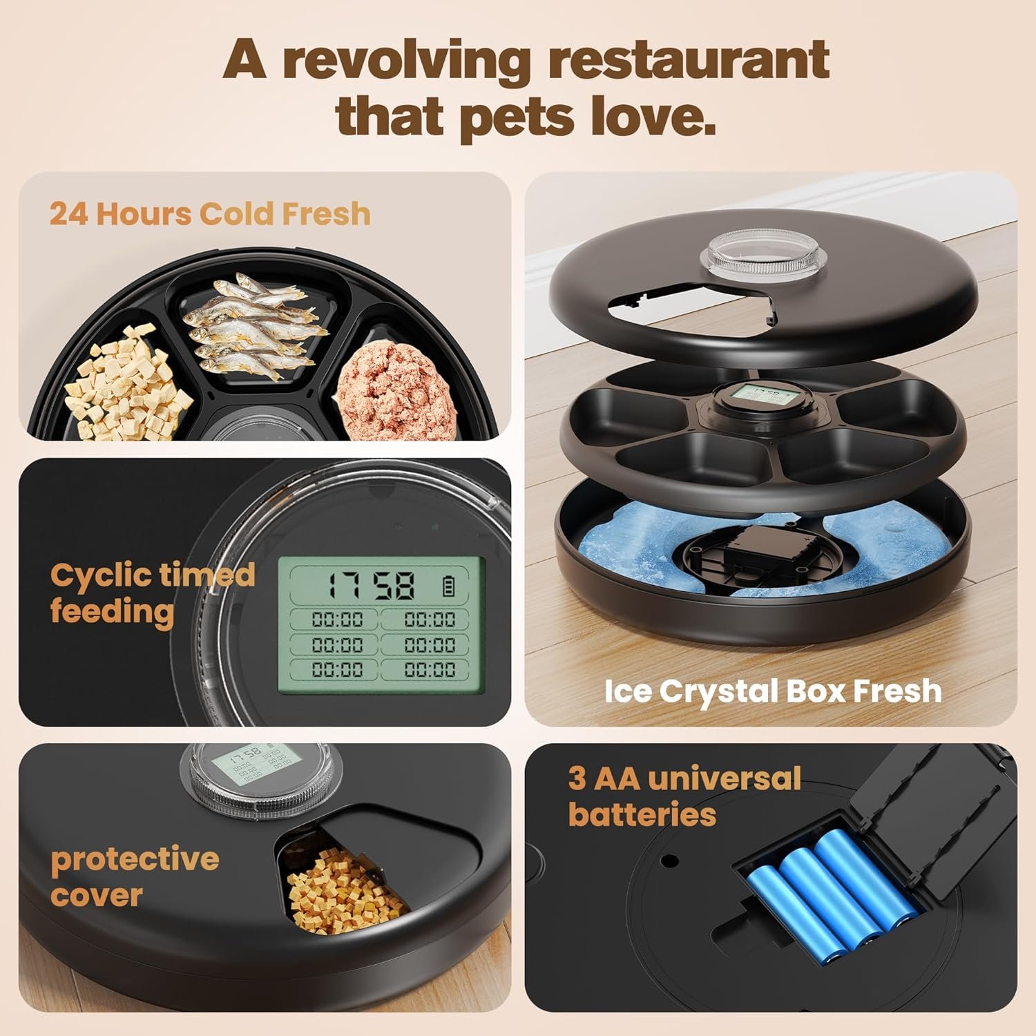 Meerdere maaltijdvoorziening: de automatische voeder van nat voedsel biedt flexibele voedingsopties met maximaal zes maaltijden. Elk voedselcompartiment is onafhankelijk, geschikt voor nat voedsel, droog voedsel en kleine traktaties om aan verschillende smaken te voldoen. Cat Feeder Automatic is perfect voor drukke gezinnen en werkende professionals, u kunt kiezen voor onmiddellijke voeding of geplande voeding, ervoor zorgen dat uw huisdieren op tijd eten, zelfs als u weg bent en gezonde eetgewoonten behoudt