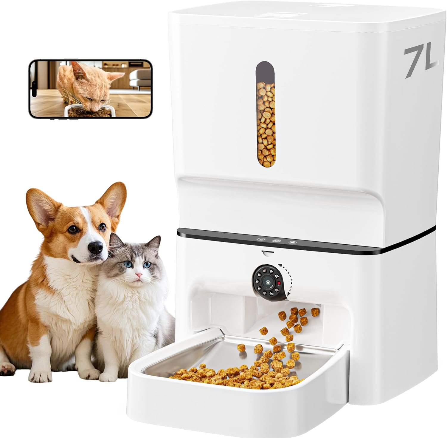 Automatische kattenvoerder met camera, 7L getimede Auto Dog Feeder, 1080p HD Night Vision Pet Feeder, 5G WiFi Cat Dog Food Dispenser met 2-weg audio, lage voedsel- en bewegingswaarschuwingen voor kattenhonden.