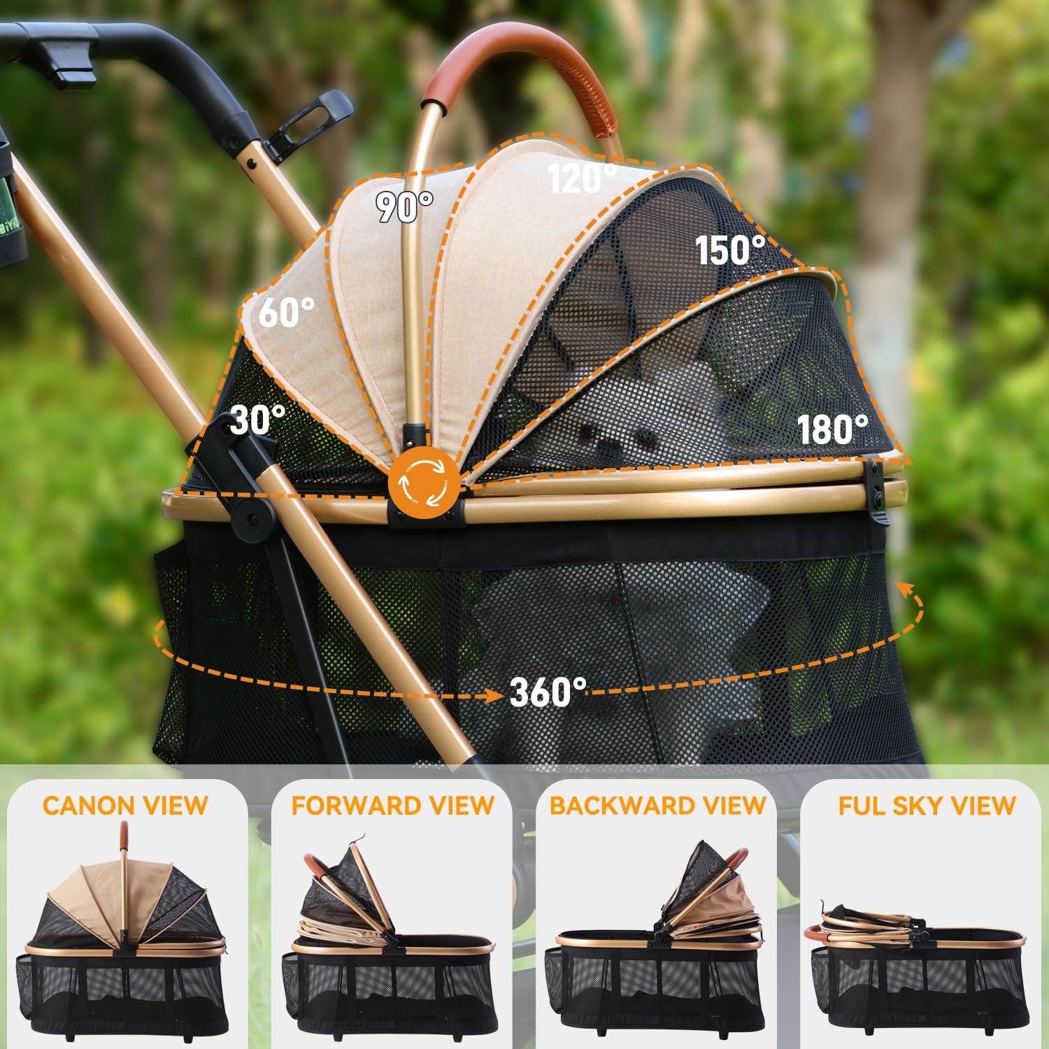 ????【 180˚Adjustable luifel en ruime opslag 】???? 180 ° Verstelbaar luifelontwerp biedt een breed gezichtsveld en 2 stukken schaduwdoek om het zonlicht te bedekken. Keerbare mesh-ramen aan beide zijden verbeteren de ventilatie, terwijl het ritsvrije schakelontwerp eenvoudige toegang tot huisdieren mogelijk maakt. De grote opbergtas aan de achterkant en de draagbare bekerhouder maakt de uitjes handiger, en de oversized opbergmand aan de onderkant kan speelgoed, voedsel en kakzakken vasthouden.