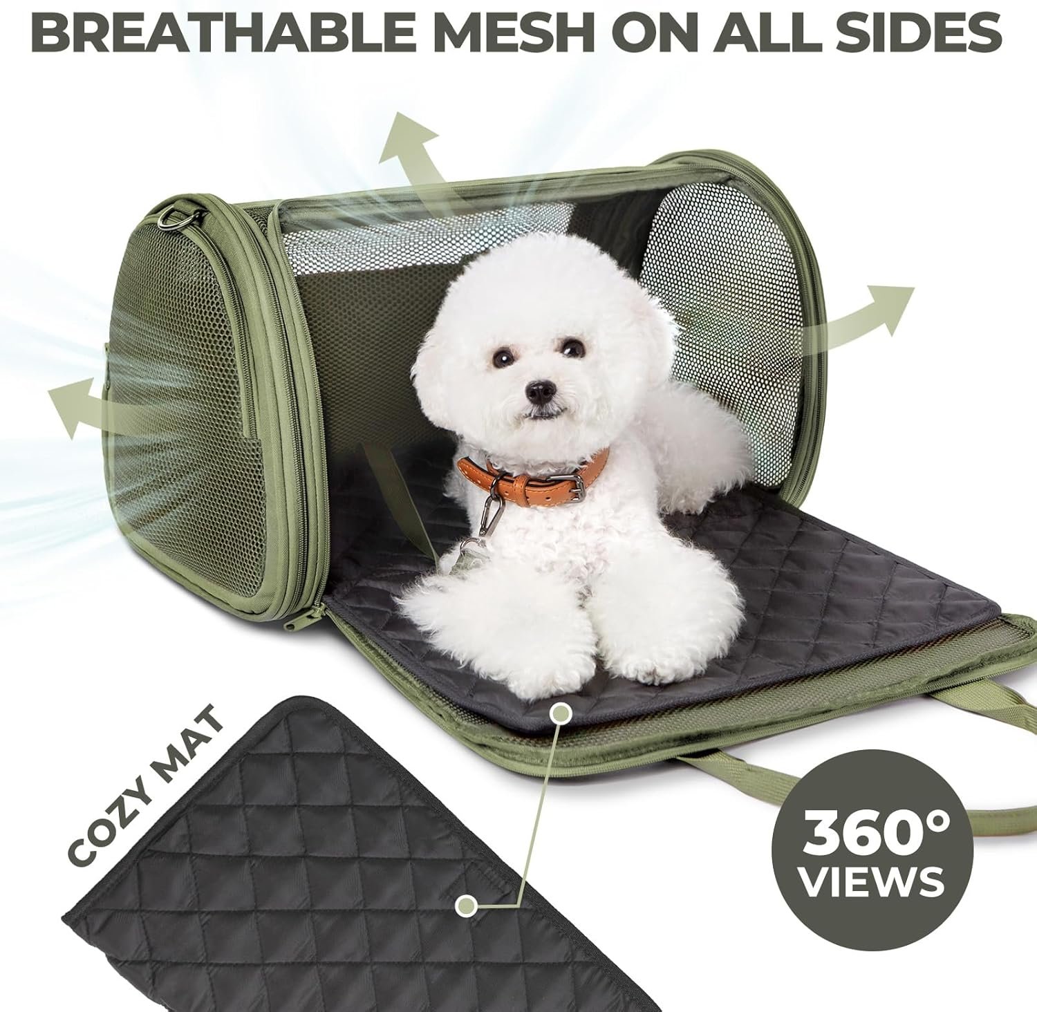 Uw perfecte reisgenoot: lichtgewicht en ademend met all-round ventilatie voor het comfort van uw huisdier. De afneembare schouderriem verdubbelt als een riem en voegt veelzijdigheid toe. Schuif je handig over je bagagekand voor eenvoudig en stressvrij transport.
