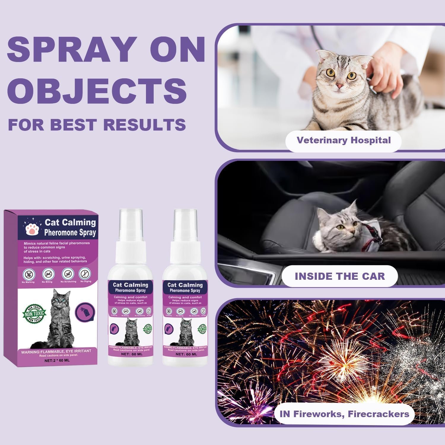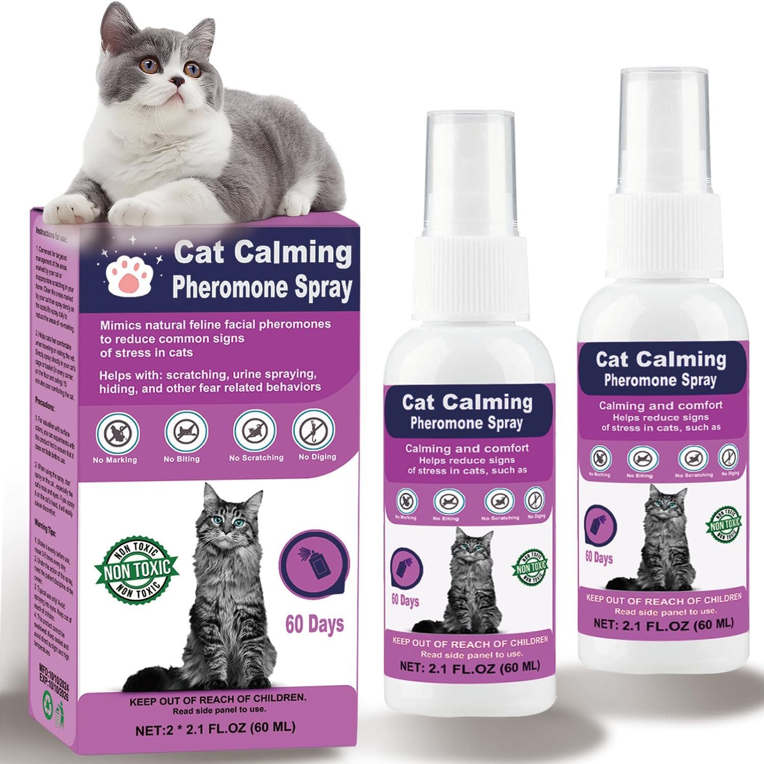 Cat Calming Feromoon Spray – Feline Calm Feromones – Anti Anxiety Pet Products, Cats Reduceert Scratching Furniture Plees Markering Markering van kalmerende kat voor vuurwerk, reizen, dierenartsbezoeken – 60 dagen kit (2 * 60 ml)