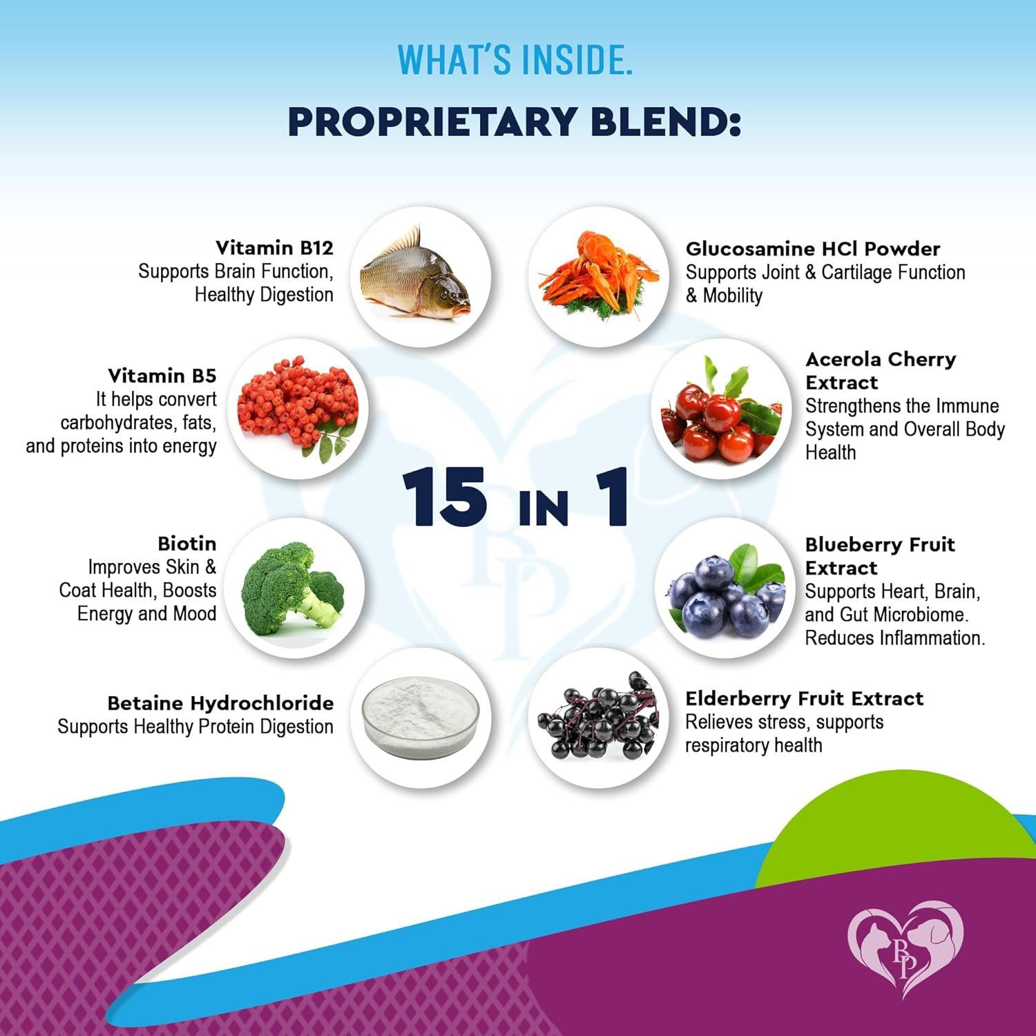✅ 15-in-1 katten en honden multivitamines: het is een opmerkelijk 15-in-1 multivitamine-complex dat uitgebreide gezondheidsondersteuning biedt voor uw huisdieren. Of een puppy, een oudere hond of een katachtige vriend, deze formule omvat vitamine A, B1, B2, B6, B12, C en D3, natuurlijke extracten en meer. Het zit boordevol antioxidanten en essentiële vitaminesets voor dieren die de immuniteit, energie en algehele welzijn stimuleren. Kan worden gebruikt met voedsel, traktaties, kauwen, poeder, traktatie, beten.