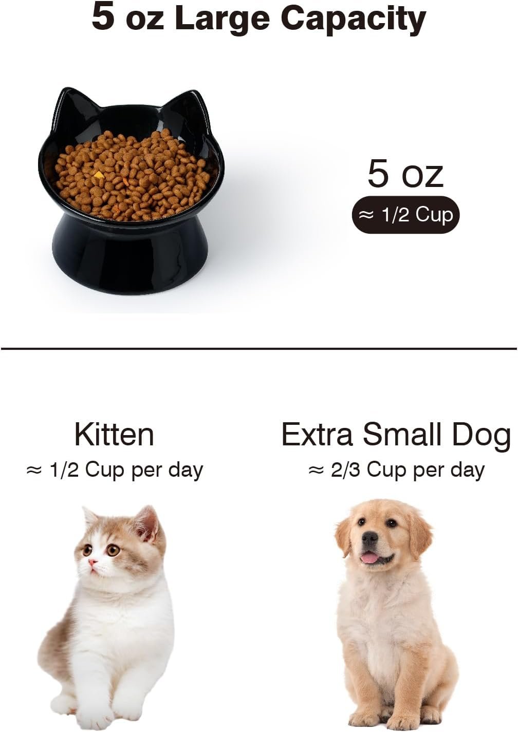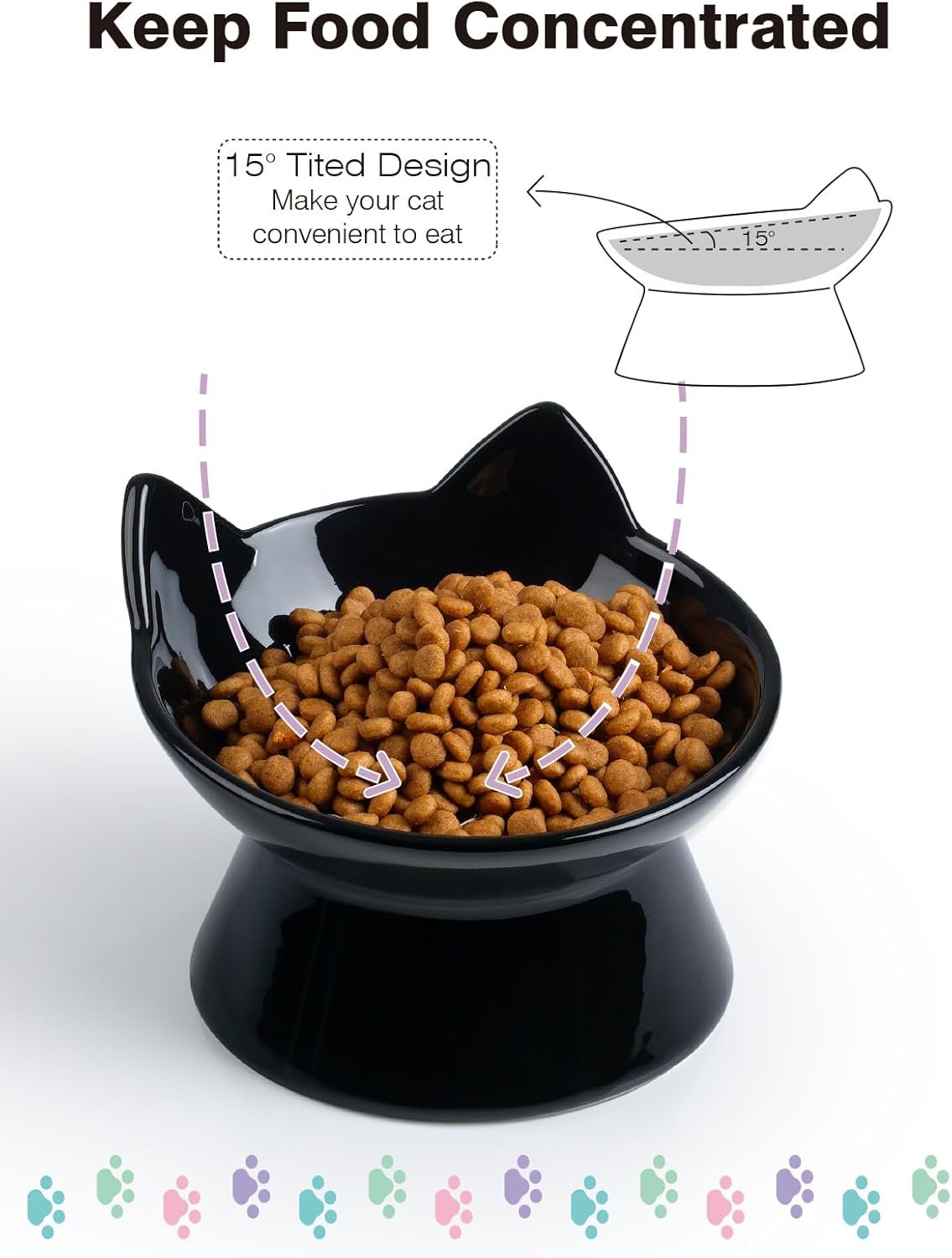 5 oz Capaciteit: houd 5 oz of 2/3 kop droog kattenvoedsel, perfecte maat voor kittenelevated ontwerp en vermindert braken: maakt het gemakkelijker voor de kat om te slikken, en vermindert af en toe braken15 ° Tilt Angle Design: laat voedsel omhoog komen en voor het midden van het centrum worden gepusht.