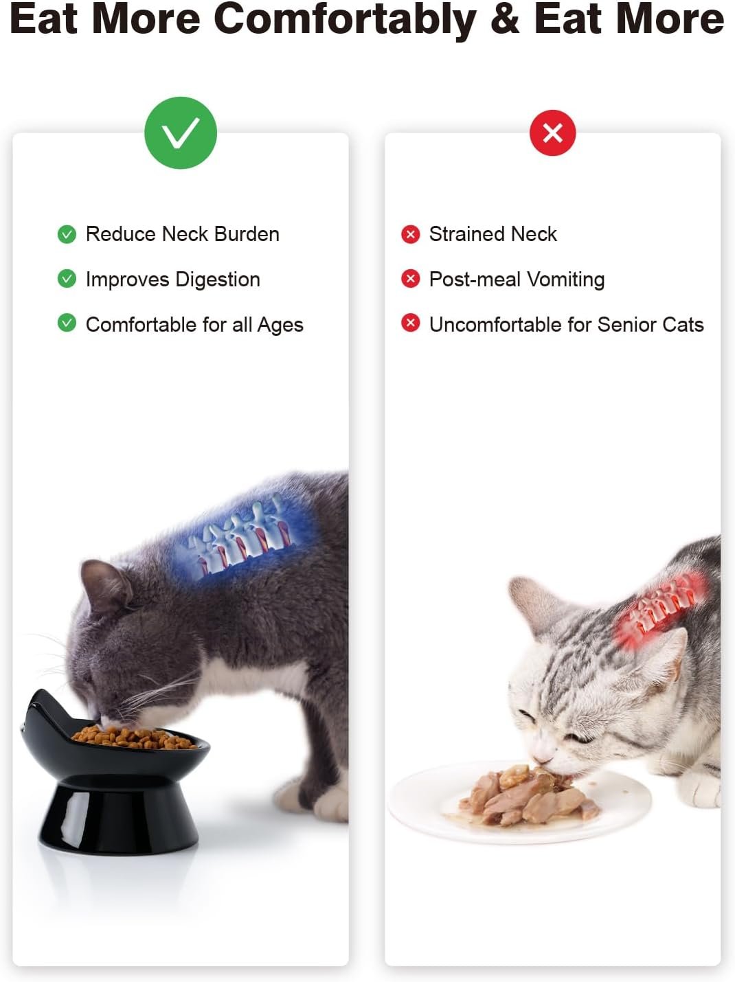Verhoogd ontwerp en vermindert braken: de verhoogde kattenkommen plaatsen de mond van de kat in een betere positie met de maag, helpt de nekspanning te verminderen, voorkomt overmatige buiging van het hoofd, maakt het gemakkelijker voor de kat om te slikken en vermindert af en toe braken.