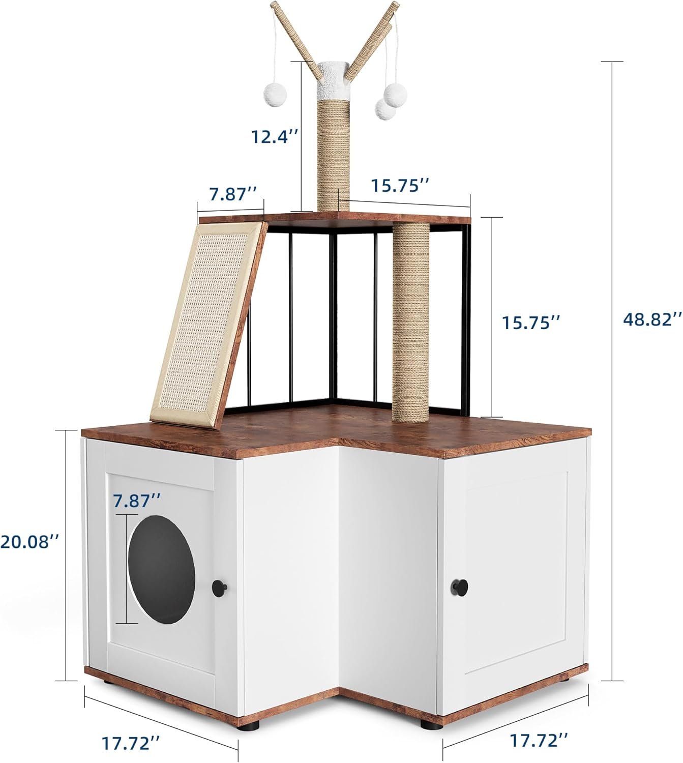 Cat Tree kattenbak behuizing verborgen kattenbak, grote hoge kattentoren voor binnenkatten grote volwassene, 2 op 1 multi -niveau 48,8 inch houten meubels met krabpaal, hangende ballen voor huisdieren
