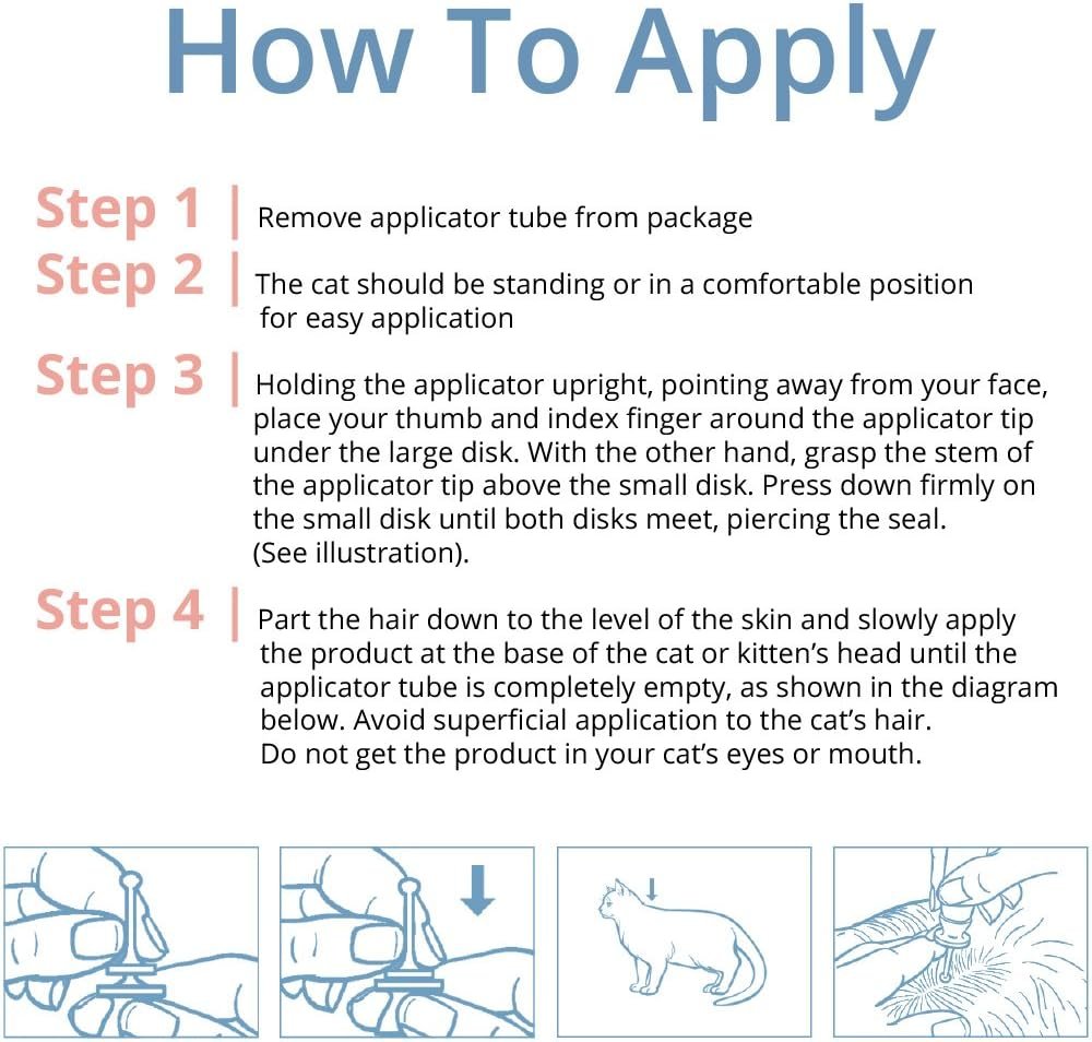 Catego for Cats heeft een unieke, afgeronde applicatortip voor eenvoudige toepassing rechtstreeks op de huid. Catego for Cats is speciaal ontworpen om zich te verspreiden over het lichaam van de kat en biedt een volledige lichaamsbescherming tegen alle stadia van vlooien gedurende een maand. Je zult ook geweldig vinden dat Catego voor katten geurvrij is, snel drogen en niet vettig. Lees het hele label voordat u het product gebruikt.