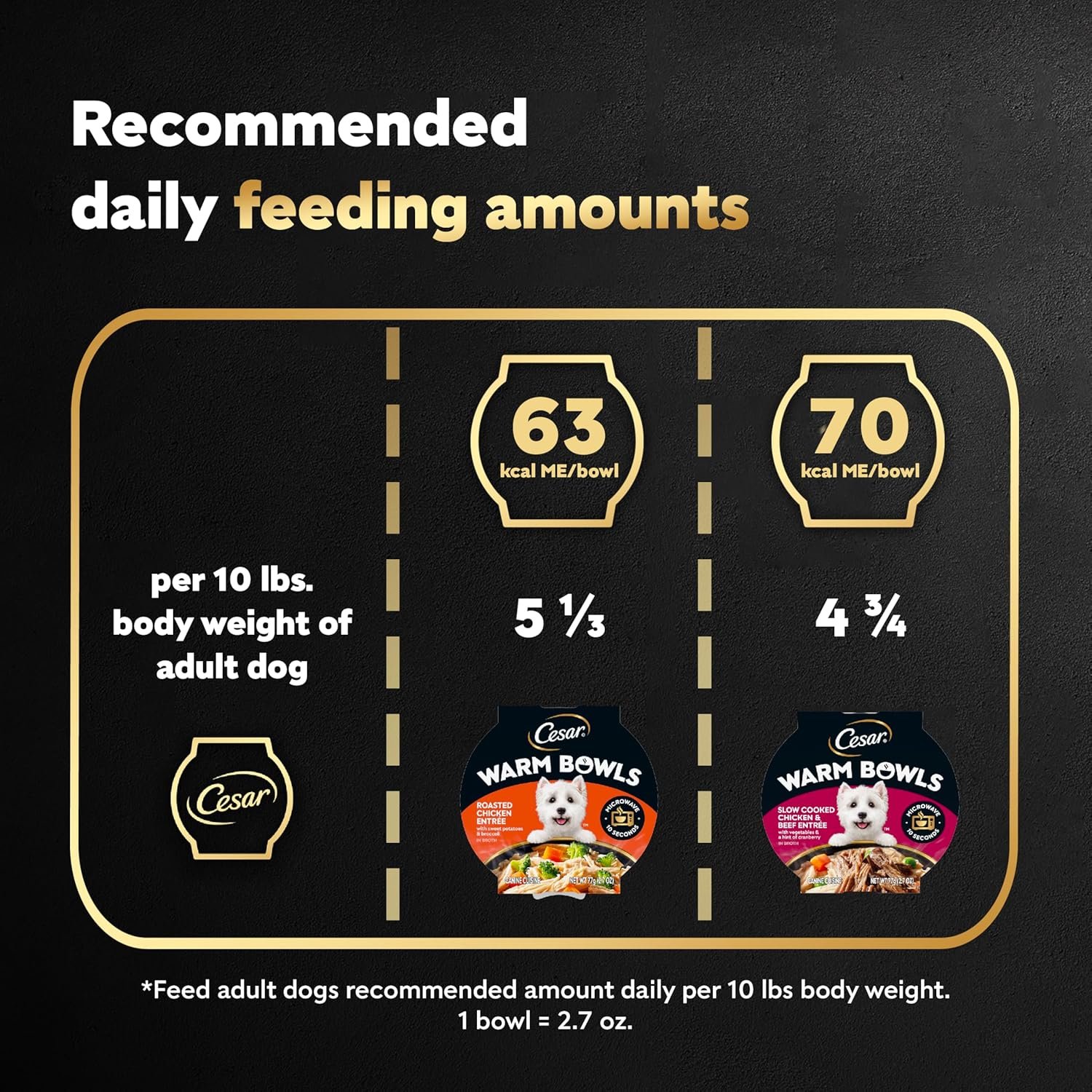 Cesar Warm Bowls Wet Dog Food Variety Pack bevat zes (6) 2,7 oz Trays: Three (3) Chicken & Beef Entree en Three (3) Geroosterde kippengang
