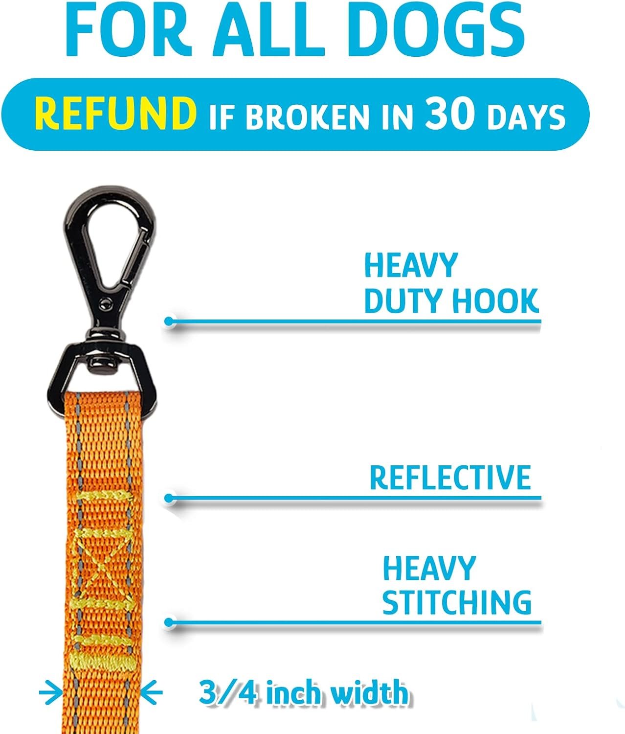 Sterke krachtriem en zware haak: de riem is sterk genoeg voor honden tot 200 pond met kracht van 1000 pond. Varrend vrij om te voorkomen dat knopen hangen. Uniek ontworpen zware haken zijn moeilijk te breken, duurzamer, beter dan andere. Versterkte quilten. Dit alles is om ervoor te zorgen dat uw hond niet ontsnapt met een gebroken riem.