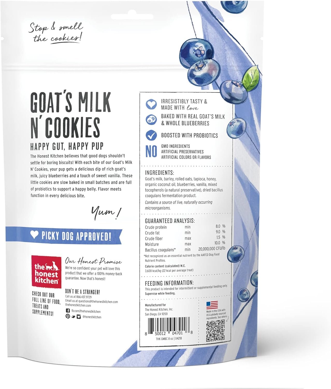 De eerlijke keuken is van mening dat goede honden geen genoegen moeten nemen met saaie koekjes! Met elke hap van onze geitenmelk n ‘koekjes krijgt je pup een heerlijke duik van rijke geitenmelk, sappige bosbessen en een vleugje zoete vanille. Elk klein koekje wordt langzaam gebakken in kleine batches en vol met probiotica om een ​​gelukkige buik te ondersteunen. Flavour voldoet aan de functie in elke hap. Over de eerlijke keuken geloven we dat het beste voedsel is gemaakt met de beste ingrediënten. Daarom gebruiken we alleen echte, zorgvuldig geproduceerde ingrediënten die je zou herkennen vanuit je eigen keuken en de enige bron van mensen die we kennen en vertrouwen (en die aan onze compromisloze normen voldoen). Het is wat we het eerlijke verschil noemen, en we kunnen niet wachten tot je het verschil ziet dat het maakt voor je huisdieren.