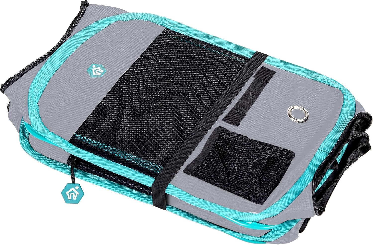 Zipper uit de bovenkant voor eenvoudige toegang + ritssluiting uit de bodem voor eenvoudige reiniging + voordeur met ritssluiting. Heeft ook opslagzakken voor voedsel, traktaties, riem, kakzakken, enz., En waterfleszak ook!