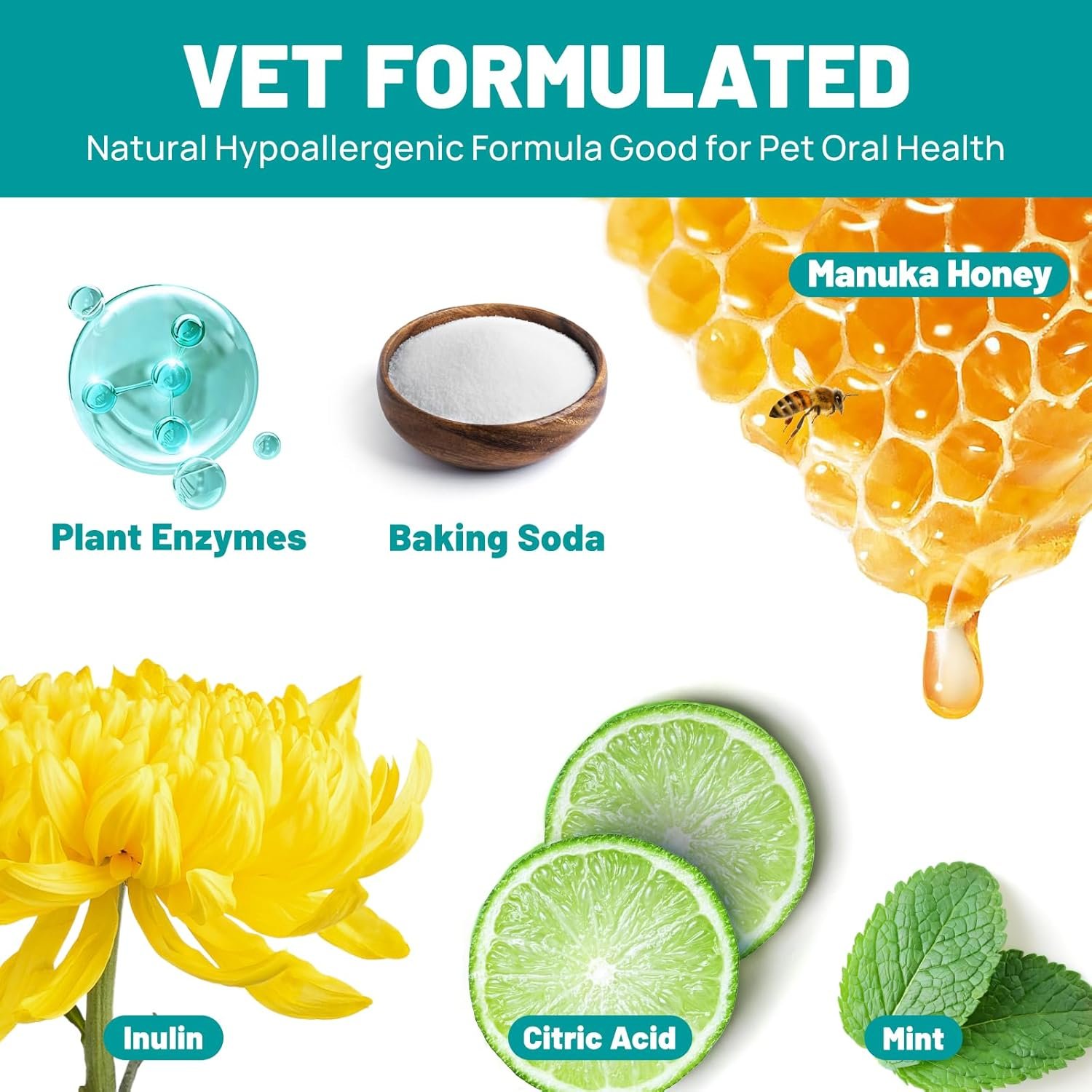 Veilige en natuurlijke ingrediënten: onze unieke formule omvat EDI -gezuiverd water, planten enzymen, bakpoeder, theepolyfenolen, inuline, manuka -honing en citroenzuur. Deze innovatieve mix is ​​alcoholvrij, verstoken van parabenen en geuren, waardoor het veilig is, zelfs als het wordt gelikt of ingenomen. Perfect voor huisdieren met gevoelige tanden, tandvlees en email.