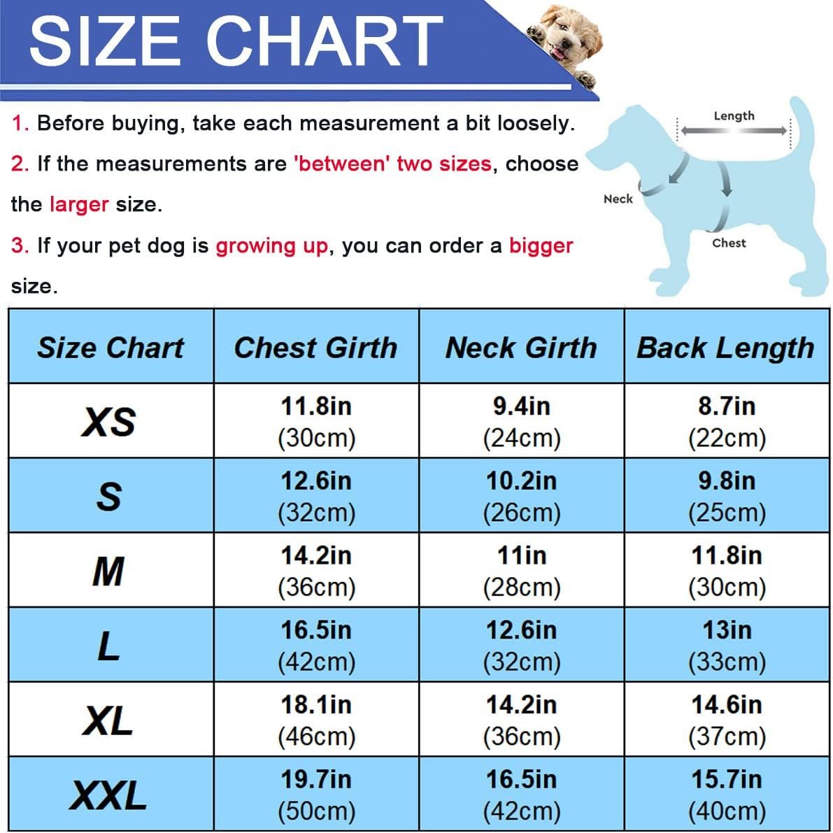 ✅ Controleer foto’s op maatdiagram, in totaal 6 maten. (Past van kleine middelgrote honden en katten) kies niet voor maat volgens uw gebruikelijke maat, maar om de nekomtrek van uw huisdier, borstomtrek en ruglengte te meten. Als het dicht bij het maximum wordt meet, raden we het grotere formaat aan voor een comfortabele pasvorm op uw hond!