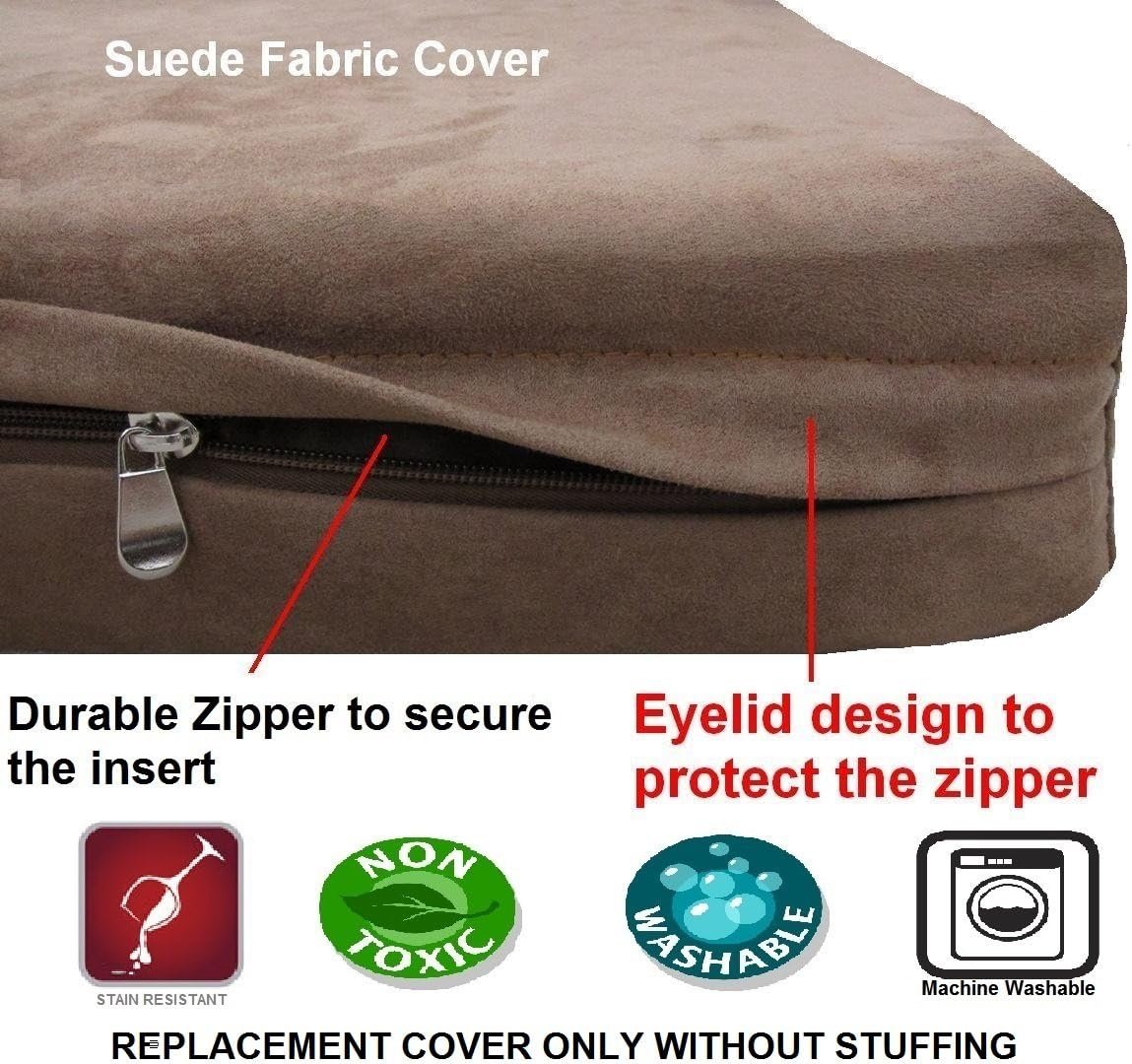 De dekking van de stof is luxe 180 GSM Synthetic Suede met vlekken, vuil en rimpelbestendig. Het wordt geleverd met een duurzame rits en sterke industriële steek voor maximaal duurzaam en comfortabel. De stof is geen kauwbestendig dat mogelijk niet geschikt is voor agressieve kauwer.
