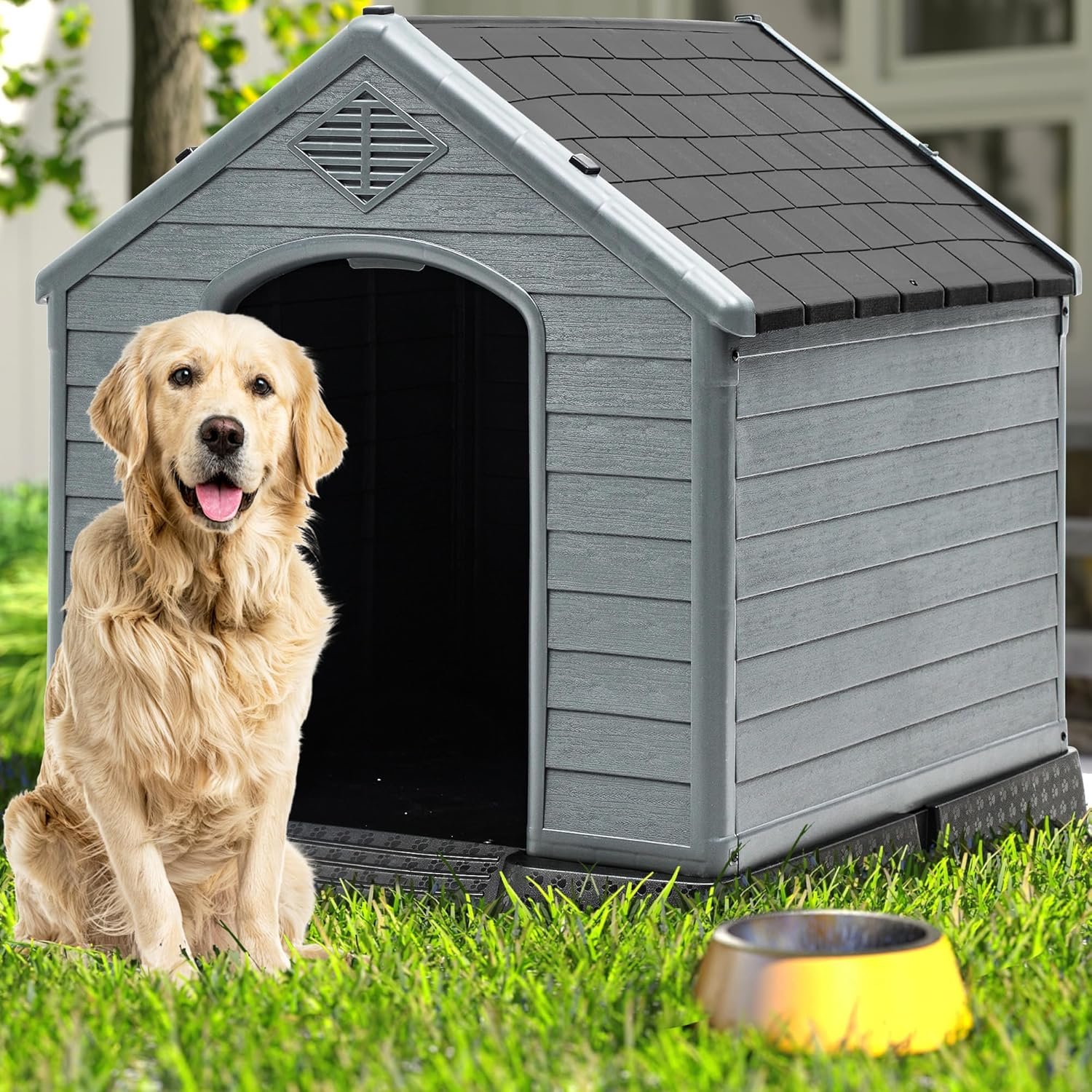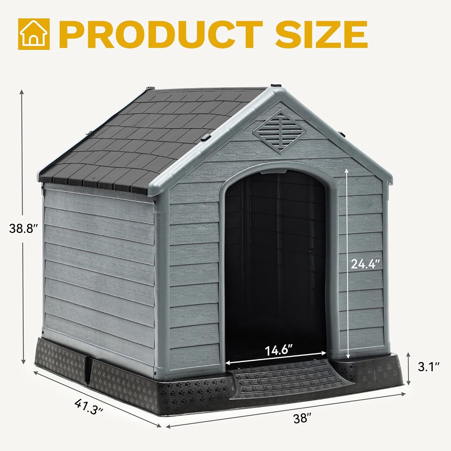 Compact en middelgrote hondenhondhuis: deze plastic schuilplaats voor huisdieren biedt royale afmetingen van 41”l*38”w*39”h, met een deur van 14,6 ”*24.4 ”, die voldoende ruimte biedt voor kleine tot middelgrote Honden op maat zoals Pomeranians, Franse Bulldogs en Teddy -rassen