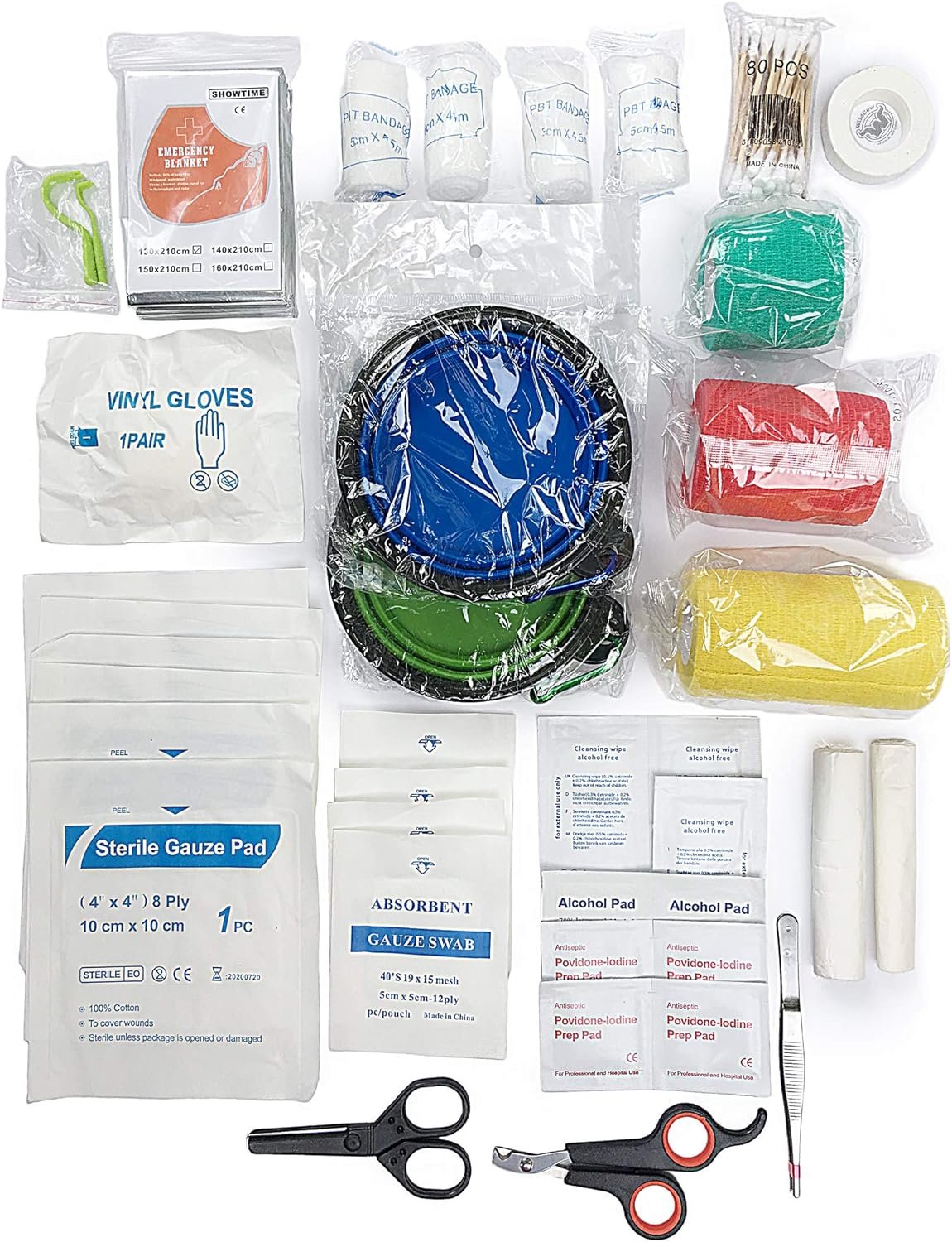 1 handschoenen (latex gratis) 1 schaar1 katoen Swabs2 Gauze rolls4 PBT-verbanden 5 cm x 4m4 Gauze Swabs 12Ply 5×56 Gauze Swabs 8ply 10×104 Antiseptic Povidone-Lodine Prep Pad3 Soap Disinfectanten (Groot en klein) 2 alcohol desinfecterende pads3 Wildcow dierenarts wrap (2,3,4 inch x 5 yards, variabele kleuren)