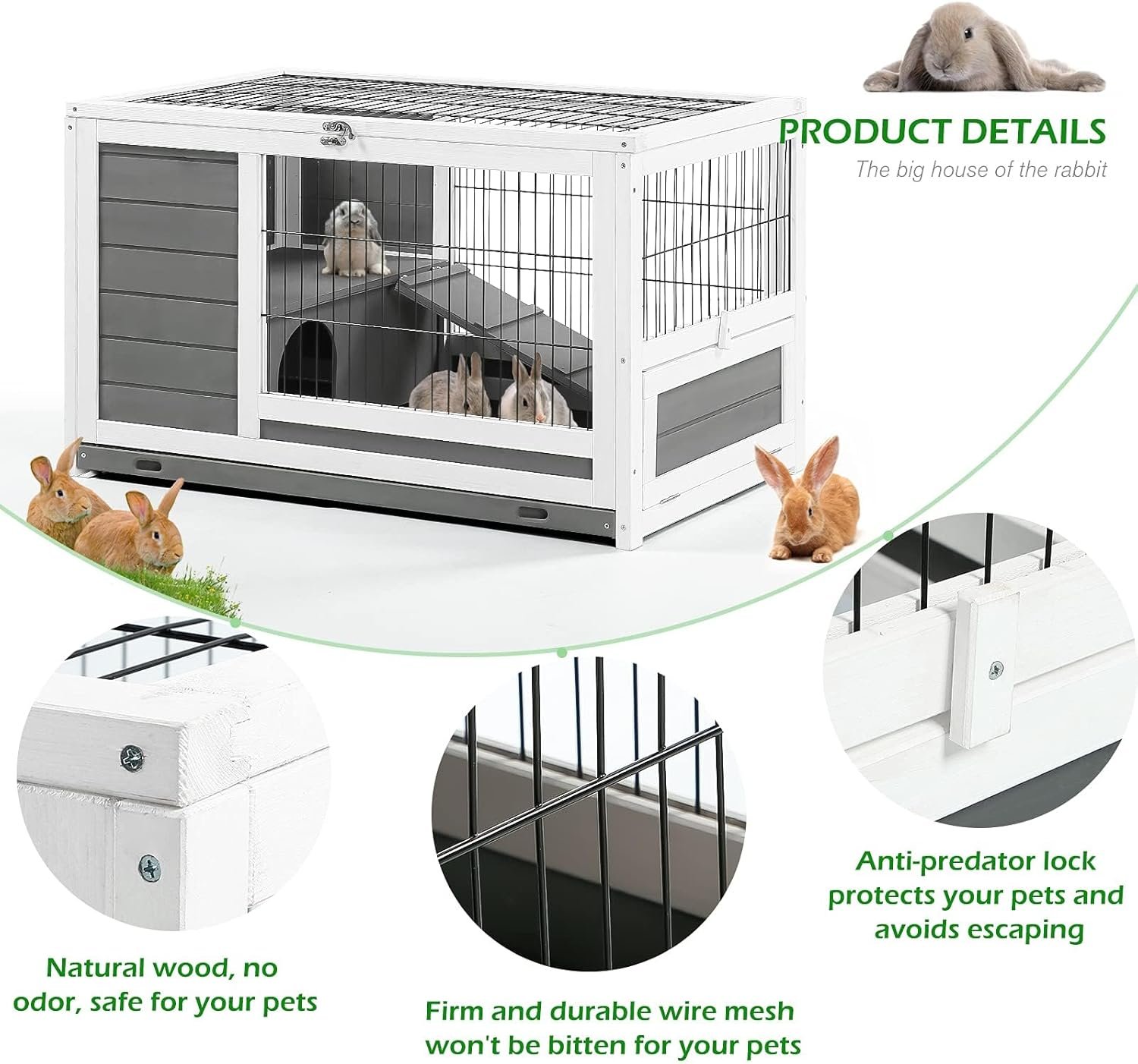 ????【 Ruim ruimte en gebruiksvriendelijk ontwerp】 Deze konijnenkooi wordt geleverd met een schuilplaats en oprit, die veiligheidsruimte biedt voor uw mooie konijntjes. Er is een glijdende helling, waardoor pluimvee gemakkelijk het verhoogde woongebied kan betreden. Er zijn houten ruggen boven de helling om je gevogelte te beschermen tegen terugglijden. Algehele afmetingen: 35,4 “x 20,9” x 20,9 “(l x w x h)