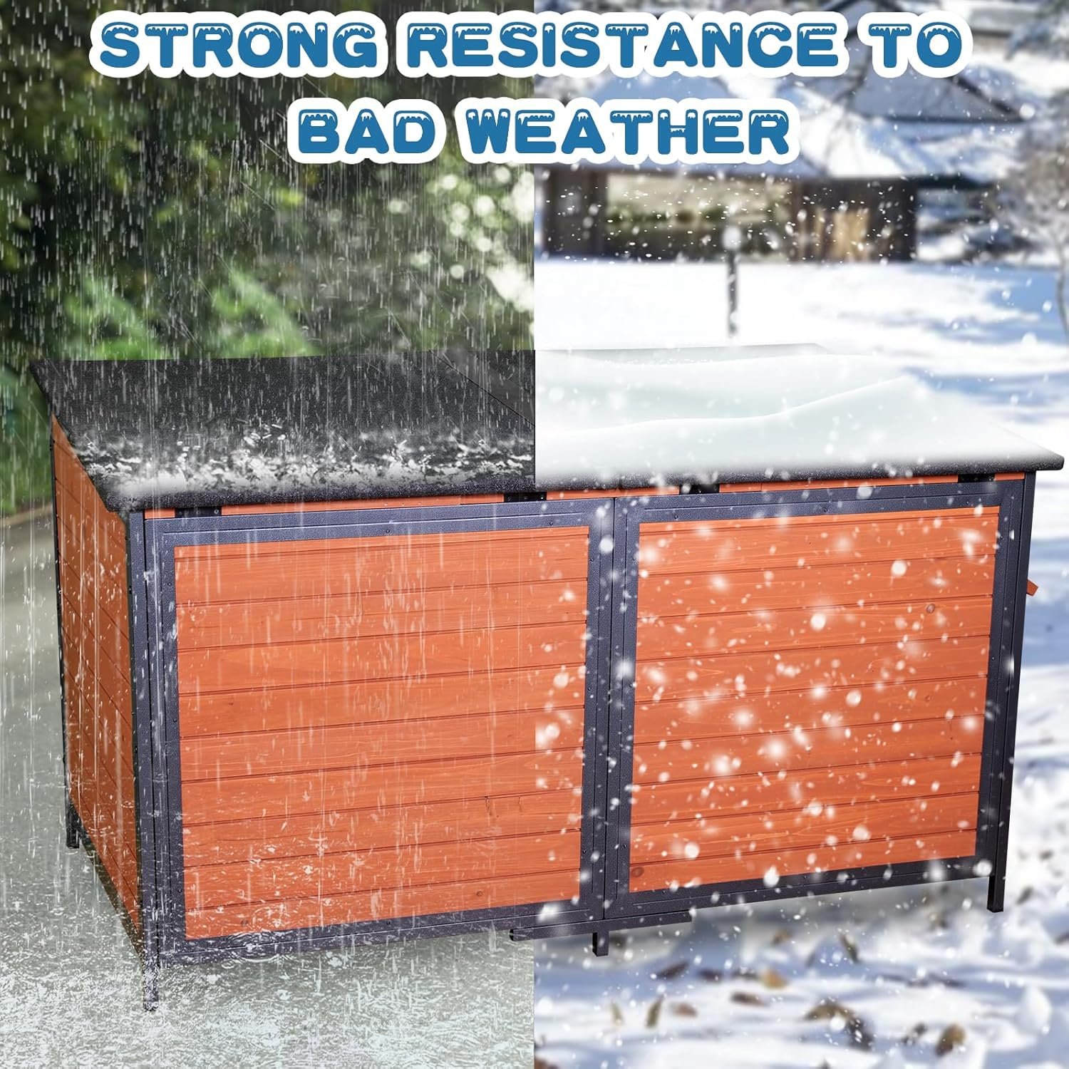 ????【 Weerbestendig en waterdicht】 Extra groot hondenhuis gemaakt van 100% FIR -hout met beveiliging van waterdichte verf, verhoogde vloer met asfalt dak en plastic gordijn bieden bescherming tegen de elementen. Het dak is schuin, dus regenval zal niet bovenaan zitten.