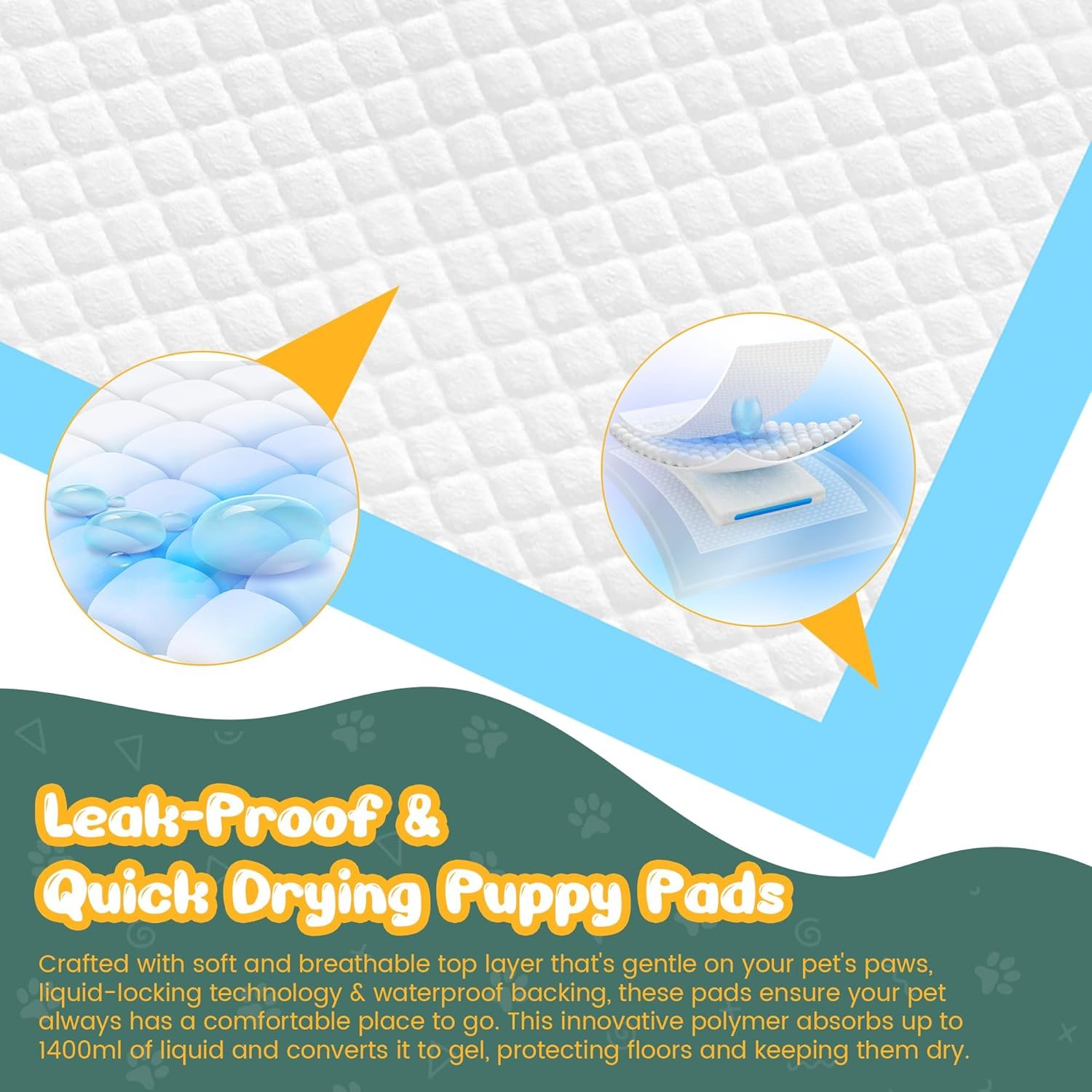 Huidvriendelijk en ultiem comfortabel: de premium doggy pads hebben een uniek 3D-diamanten quiltontwerp op de ultra-zachte wicking fabric niet-geweven laag, bieden een comfortabele touch voor uw huisdieren. En de superabsorberende polymeer absorbeert vloeistof snellere, verbeterde verdikte PE-film is veel meer lekbestendig, traanbestendig en duurzaam, de polymeerkern verandert urine snel in gel, houd huisdieren droog en schoon de hele dag schoon. Het is een goede keuze om voor het dagelijkse leven van uw hond te zorgen.