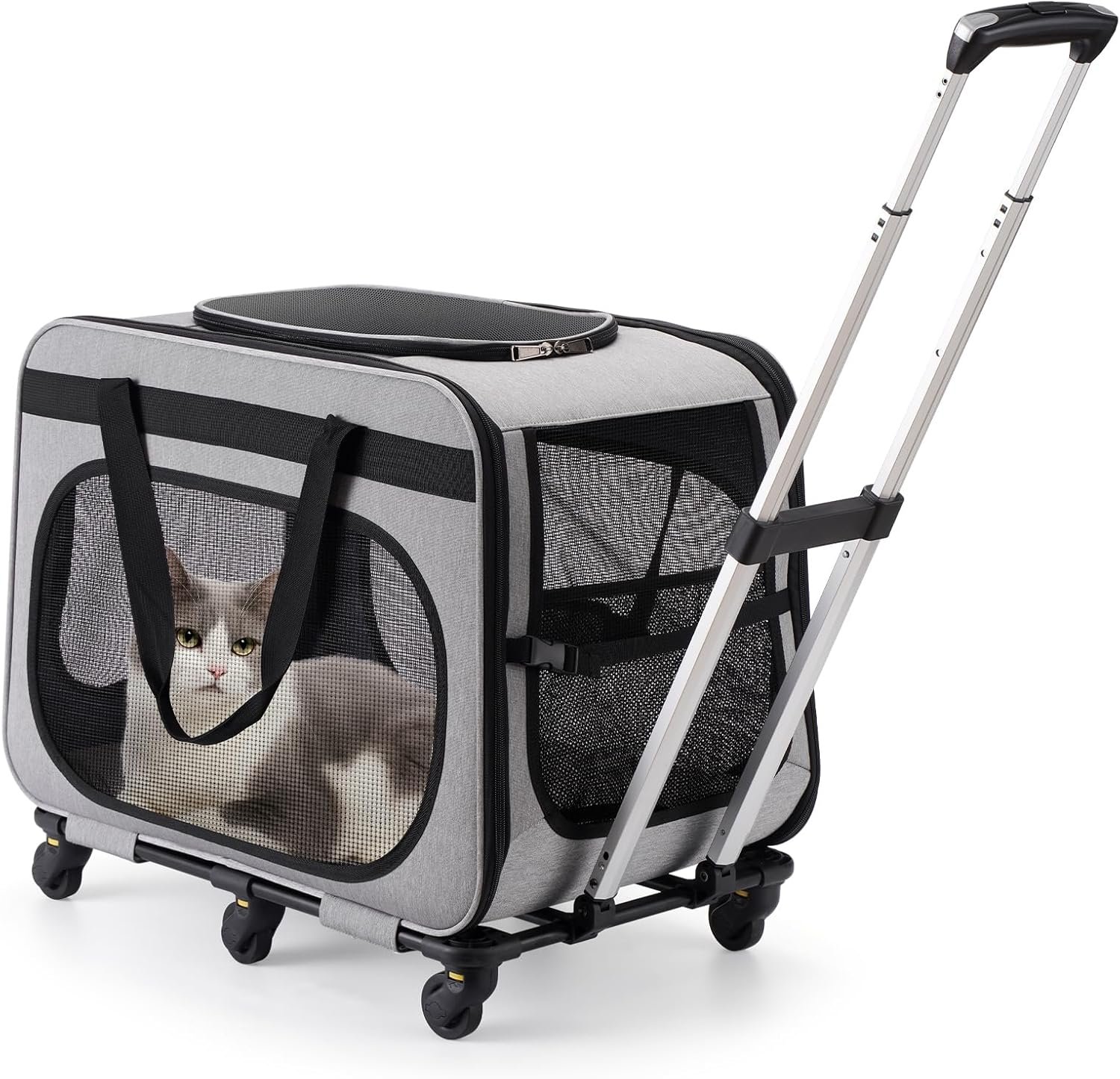 Extra grote huisdierdrager met wielen voor kleine honden en katten met alle rassen, kattenrol voor maximaal 4 katten, ondersteunen tot 40 pond, grijs