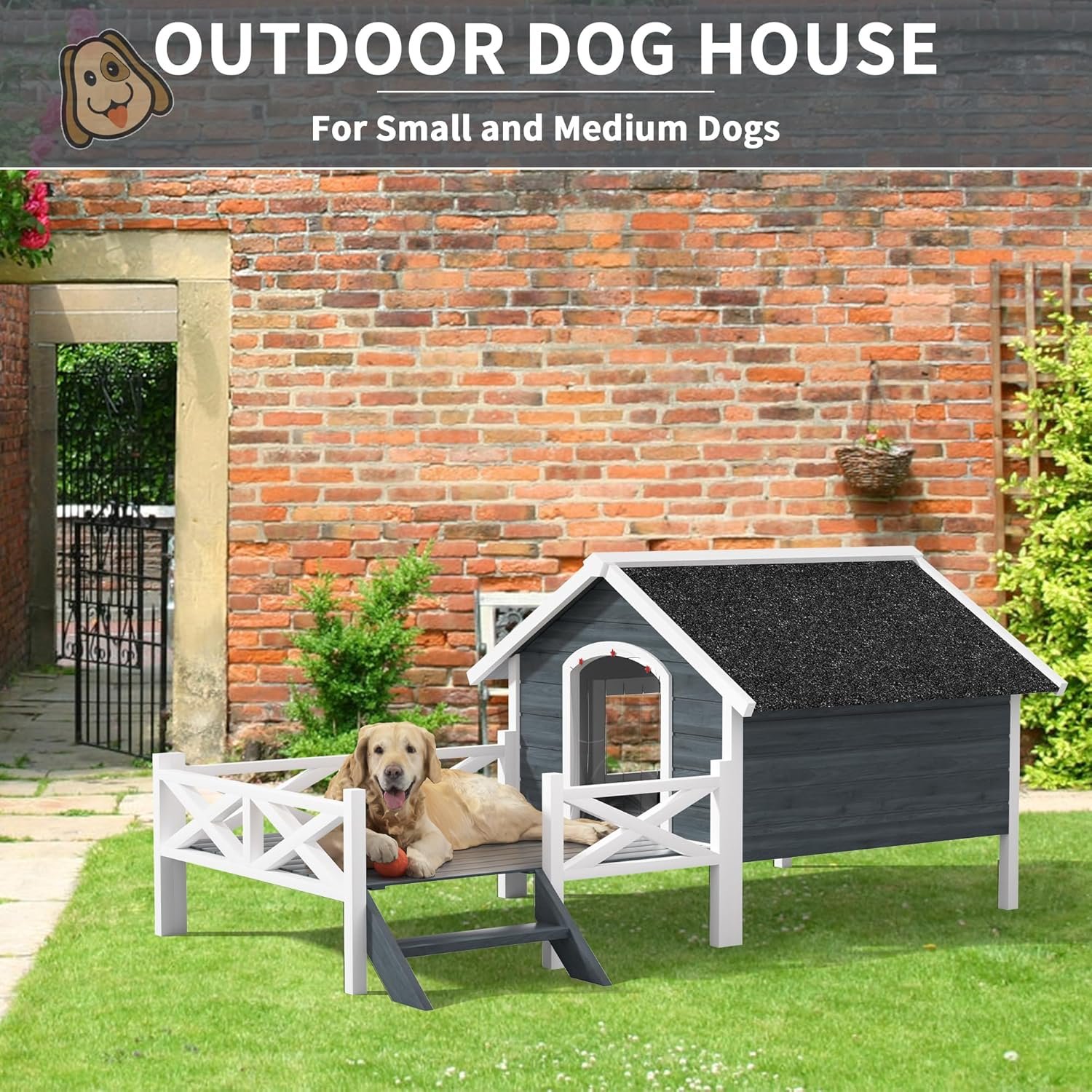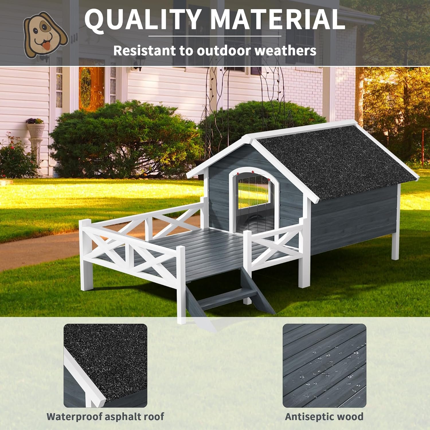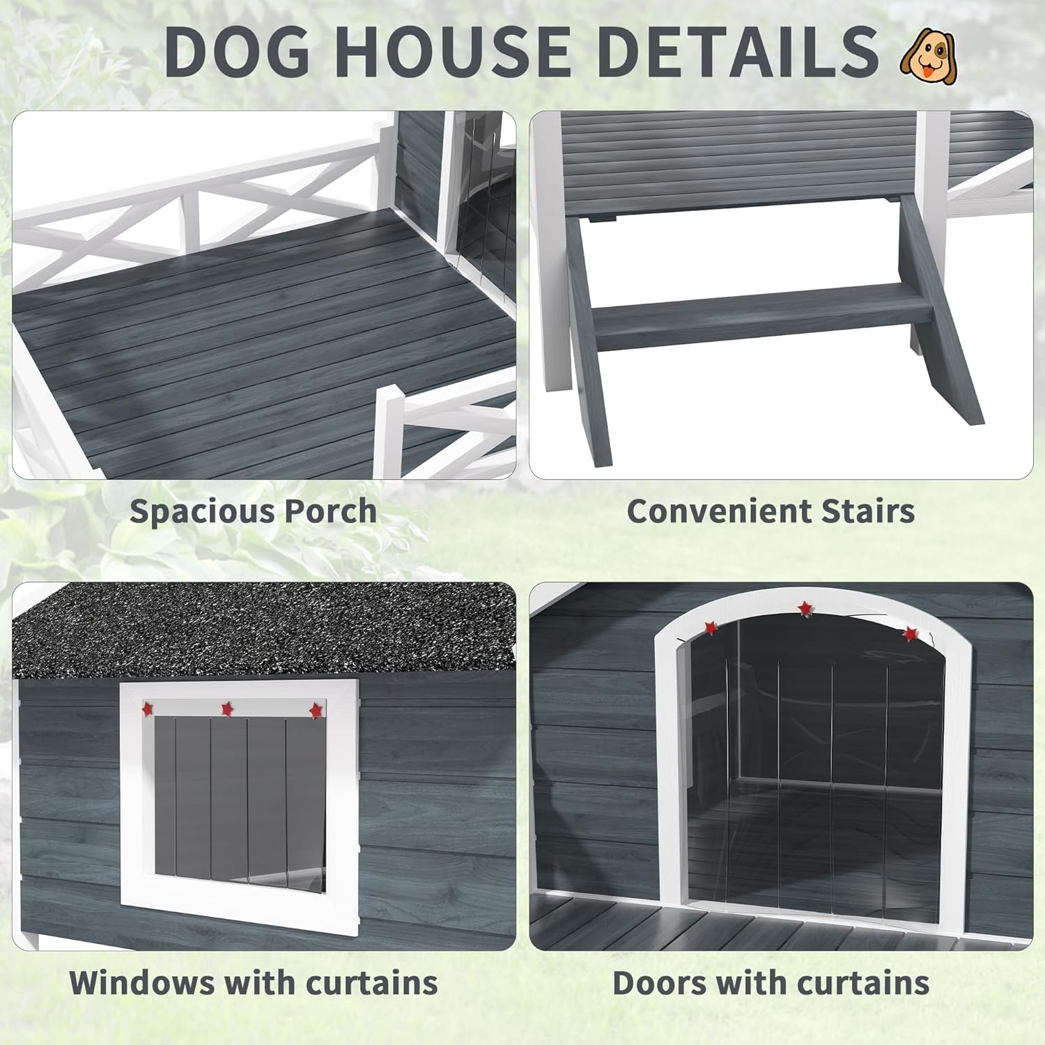 Groot buitenhondenhuis met veranda, 67 houten hondenhuis weerbestendig voor buiten, waterdichte asfalt dak en buitenmateriaal, huisdierhuis voor kleine middelgrote honden, grijs