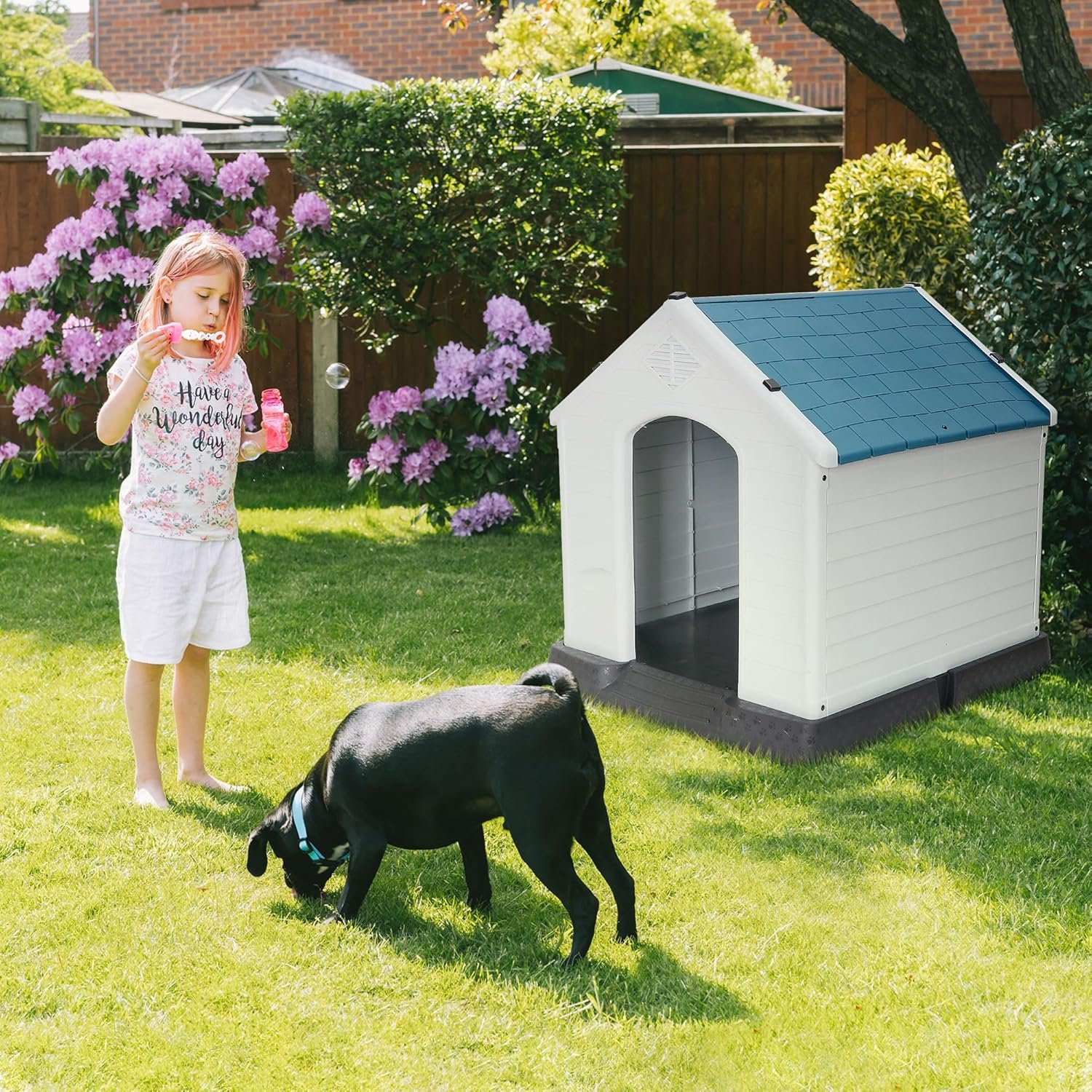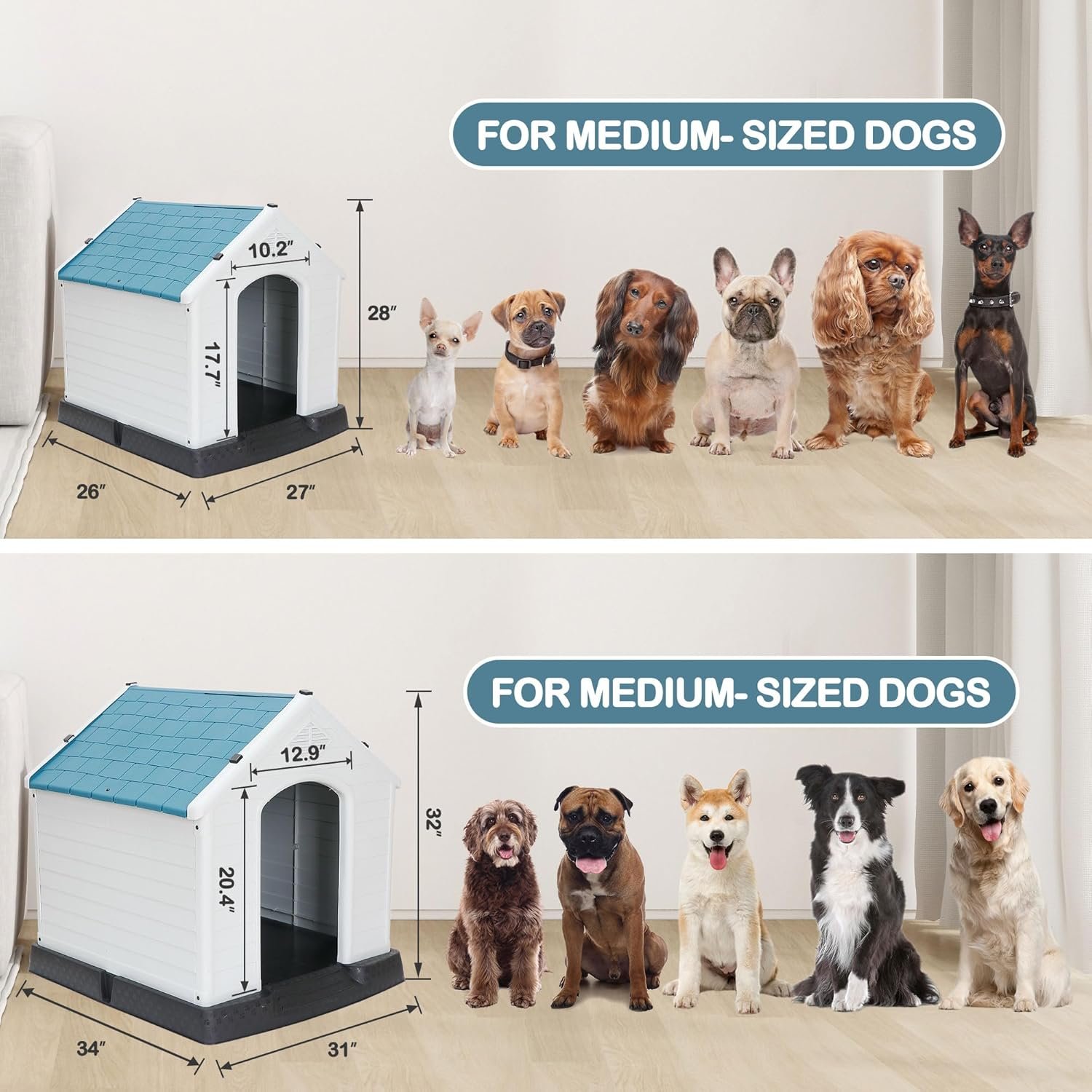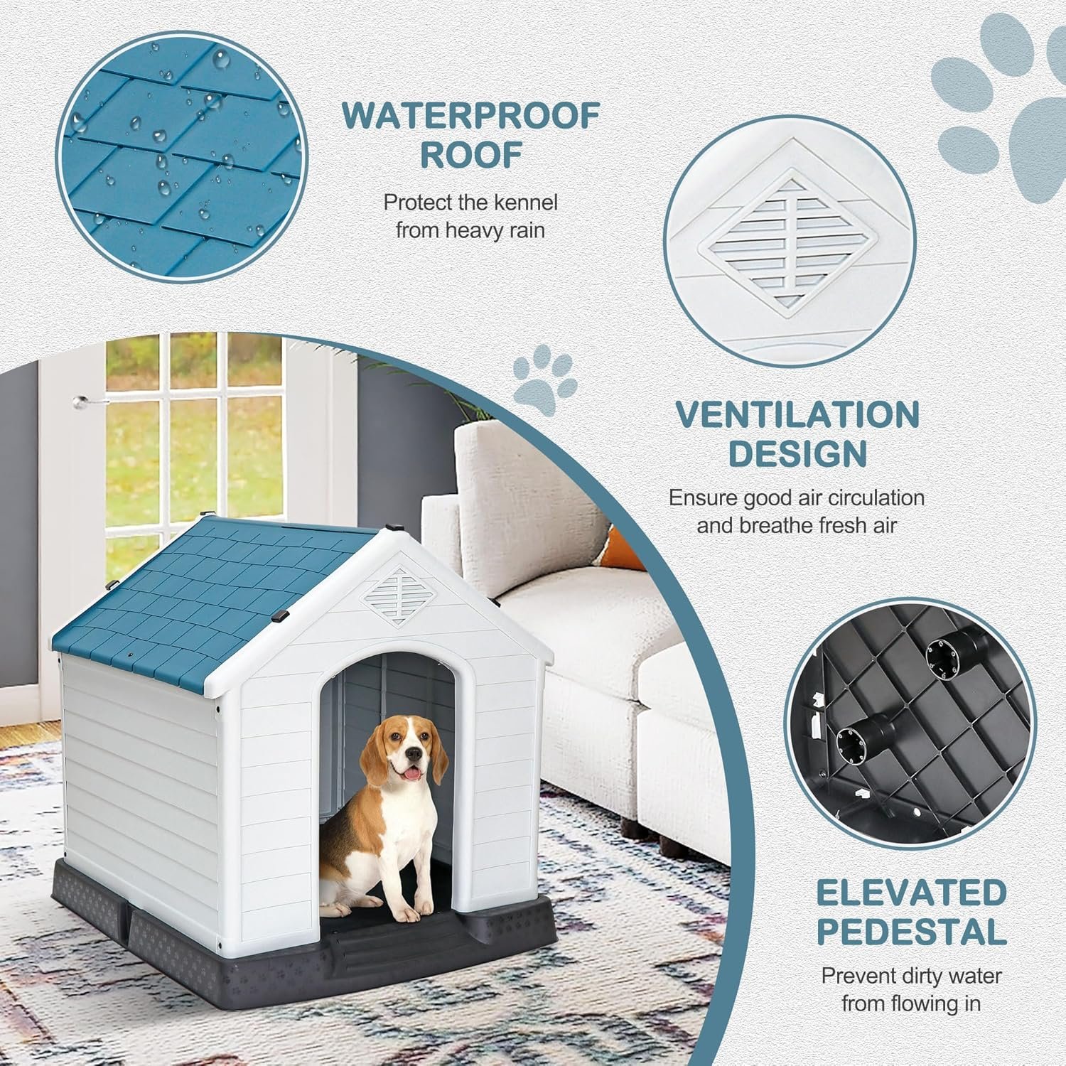 Groot hondenhuis binnenshuis buiten plastic duurzaam hondenhuis geïsoleerde puppy -opvang met lucht ventilatieopeningen verhoogde vloer (blauw, 28 inch)