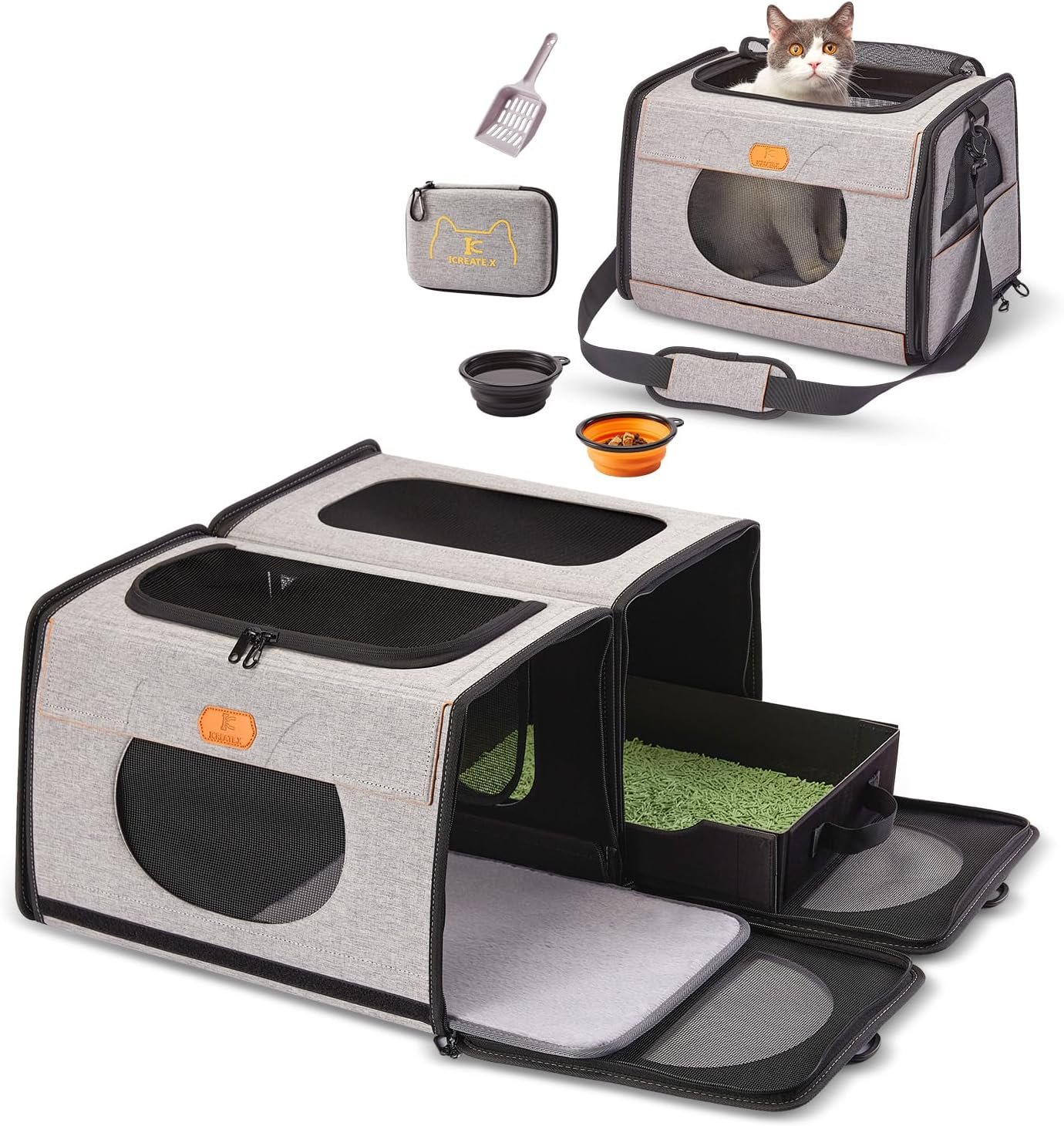 Grote kattendrager met kattenbak voor autorijden, huisdier draagtas 2-in-1, dubbele kattenreistransportdrager voor lange afstand, opvouwbare hondenkrat, kattenzak voor kitten 2 katten