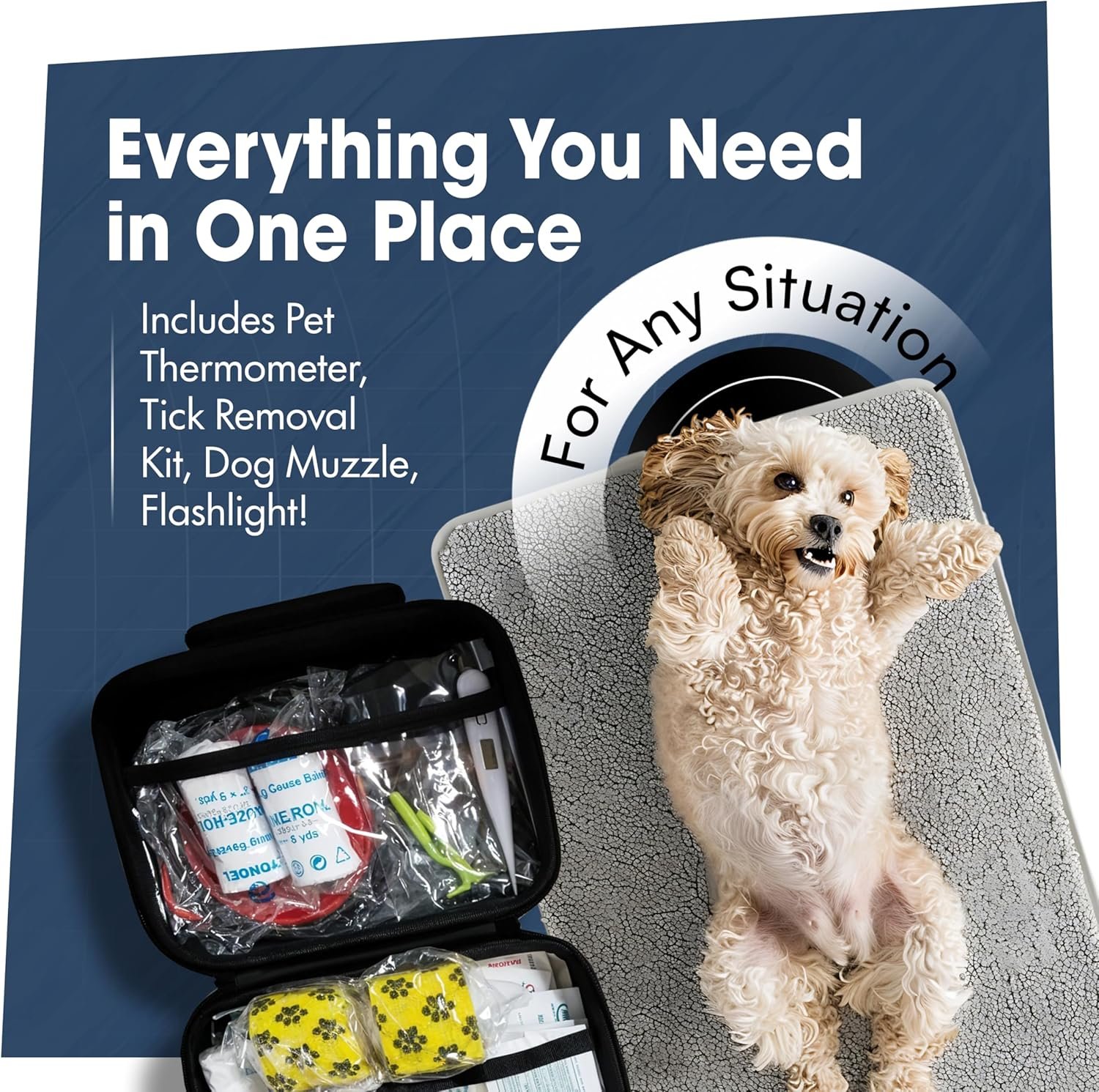 ???? Volledige noodpakket voor elke situatie: buiten de standaard PET EHBO -benodigdheden, bevat onze kit vitale extra’s zoals een hondenthermometer, een hondensnuit, een tekenverwijderingskit, een zaklamp en een handig Mini EHBO -zakje. Wees volledig uitgerust om een ​​noodgeval voor huisdieren af ​​te handelen, of het nu voor uw hond of kat is, waar u ook bent.