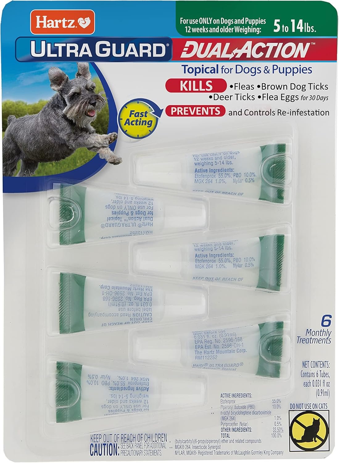 Hartz Ultraguard Dual Action Flea & Tick Topical Dog Treatment and Flea and Tick Prevention, 6 maanden, 5-14 pond honden met 6 tellen (pakket van 1)