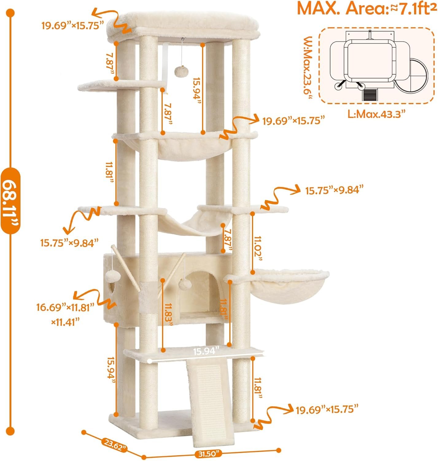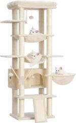 Heybly Cat Tree voor binnenkatten grote volwassene met een groot platform, 68,1-inch lange kattentoren met met sisal bedekte krassende palen, multi-level kattenmeubilair met hangmatten, beige HCT035M