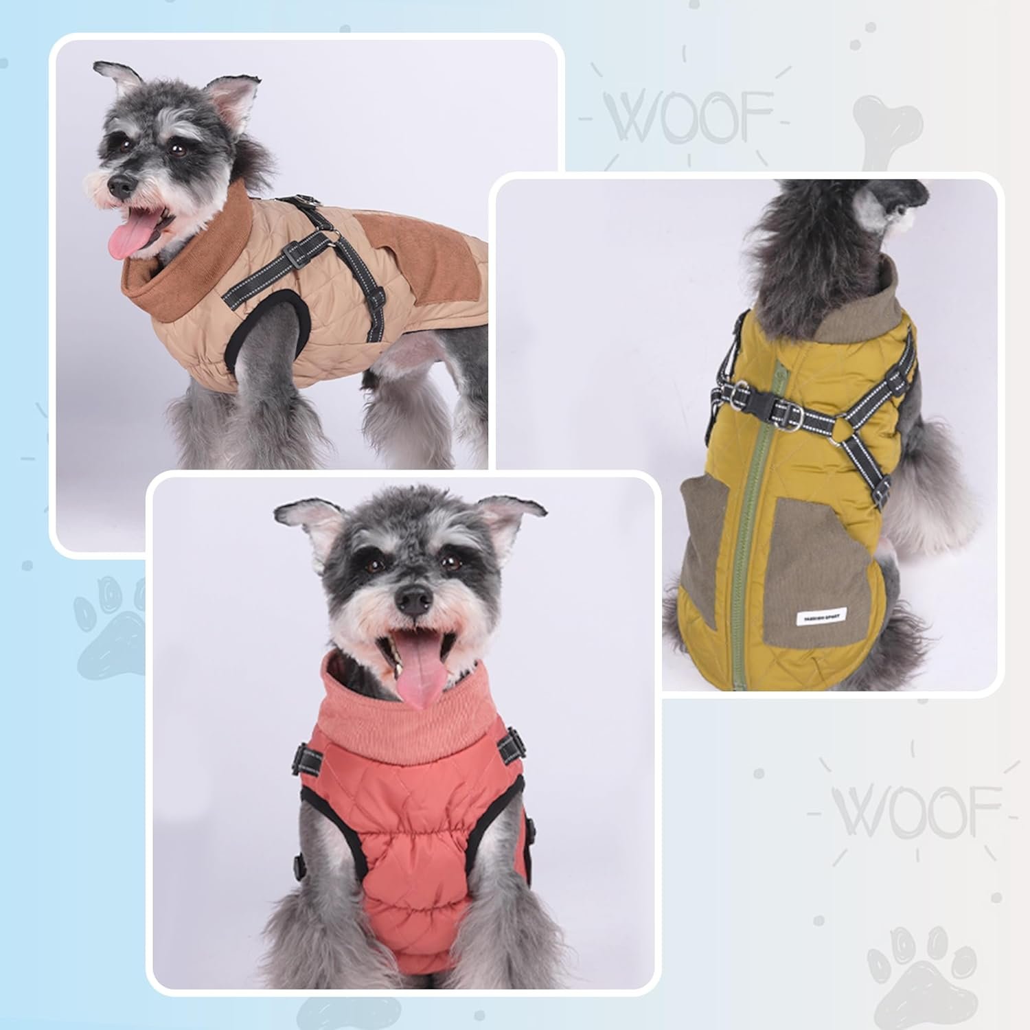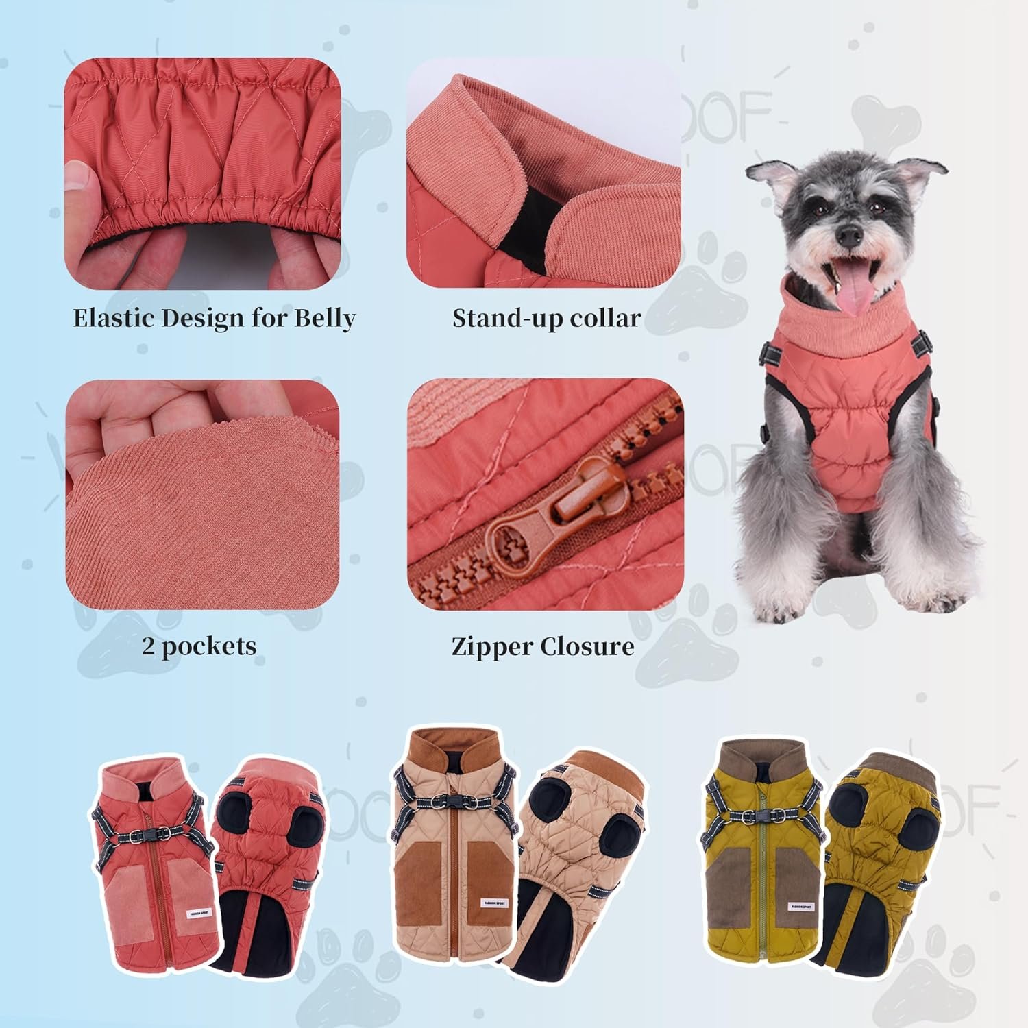 Er zijn in totaal 3 kleuren, kaki, koraalroze en olijfgroen. In tegenstelling tot zwart, wit en grijs, laten deze heldere en unieke kleuren honden er mooier en schattig uitzien in de winter.