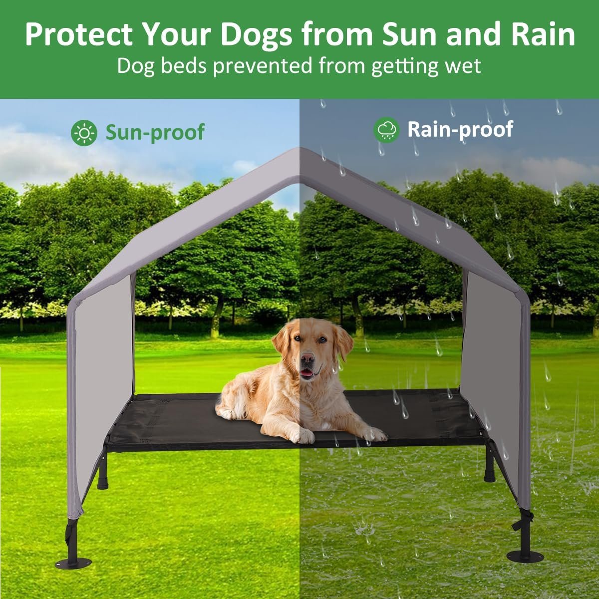 Waterdichte en zonneperte schaduwluifel – Ons hondenhuis heeft een afneembare waterdichte polyester stoffen schaduwluifel, het kan effectief zonlicht en regen blokkeren, wat zeer geschikt is voor gebruik buitenshuis. Geef uw geliefde huisdier een plek om te ontspannen met dit draagbare en stevige huisdierbed