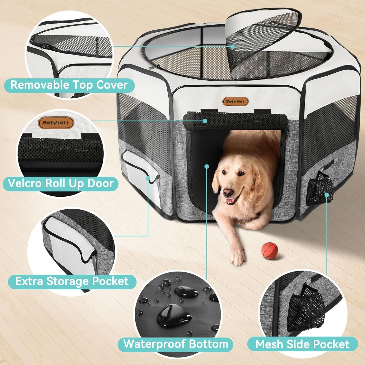 Superior Designn – Roomy 8 Panel Design Dog Kennel Indoor met beschermde naden en versterkte hoeken. Duurzame waterbestendige 600D Oxford-stof maakt het reinigen eenvoudiger. Verwijderbare half-mesh-bovenkant en deur met ritssluiting met klittenband bieden handige en beveiliging, en zijzakken van buitenaf bieden een handige plek voor persoonlijke items enz.